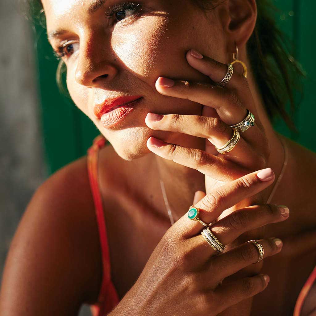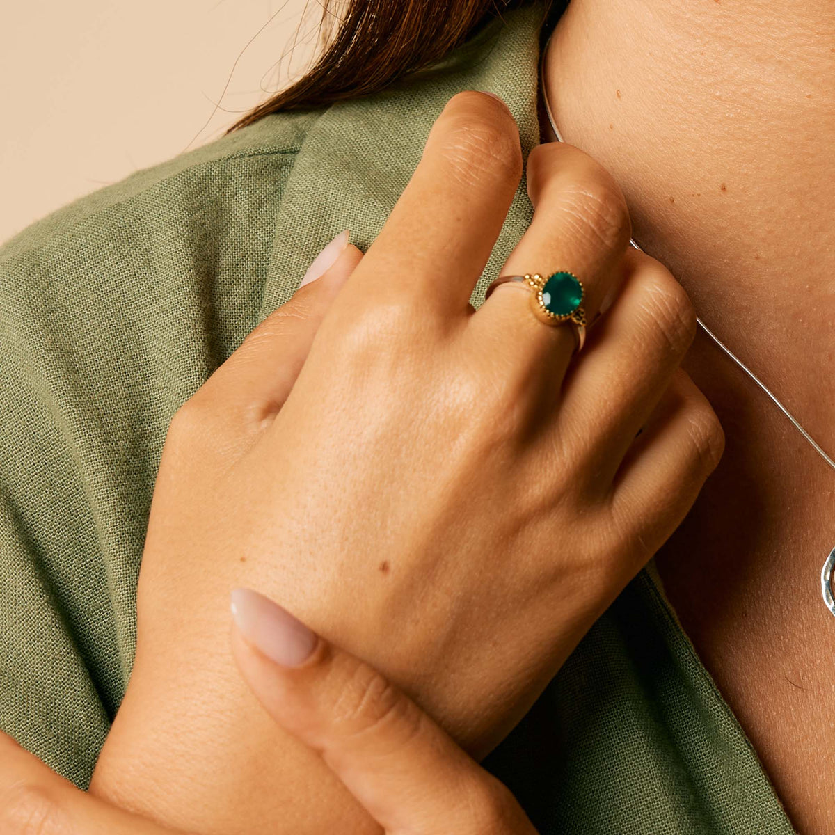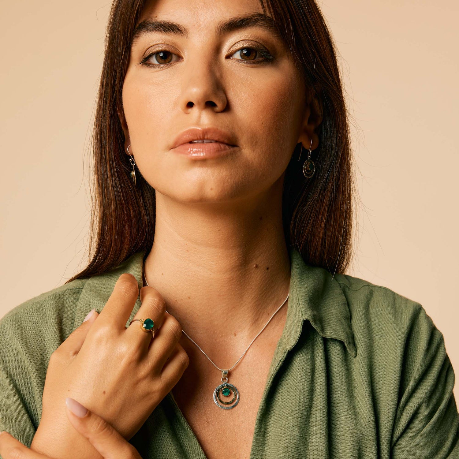 This Sundar Silver Ring by Charlotte's Web Jewellery is a beautiful accessory that soothes the body, mind, and soul. Handmade with a faceted green onyx and sustainable sterling silver, this spiritual solitaire ring lends brilliant color to any statement stack. Green onyx is believed to promote self-worth, making this ring a meaningful and beautiful accessory. Each ring is unique due to the use of real stones, adding to its personal charm.