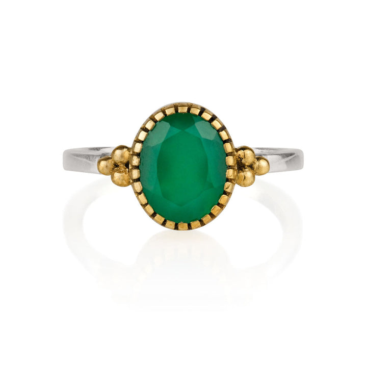 This ring is handmade with sterling silver and a faceted green onyx. It is available in different gemstones.