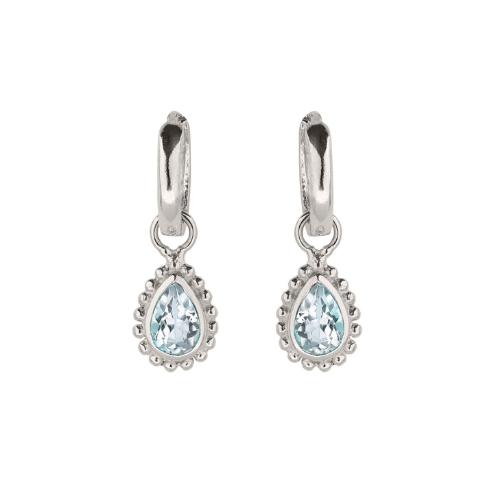 These March Birthstone Sterling Silver Huggie Hoops - Aquamarine by Charlotte's Web Jewellery are a cool and calming accessory. The hoops feature light blue aquamarine in a signature Rawa setting. They are handmade in India from sterling silver. Aquamarine is said to inspire courage and tranquility, making these a perfect gift for those born in March. The earrings are hypoallergenic and nickel-free.