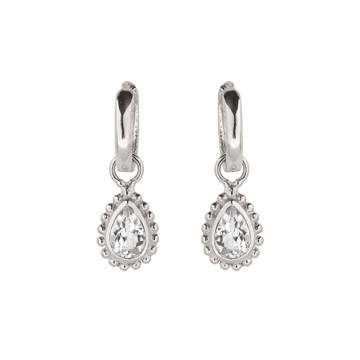 These April Birthstone Sterling Silver Huggie Hoops by Charlotte's Web Jewellery are elegant and radiant. They showcase shimmering white topaz in a classic pear-shaped silver setting. White topaz, the April birthstone, symbolizes clarity and truth, making these a meaningful gift or personal keepsake. They are handcrafted from sterling silver and are hypoallergenic and nickel-free.