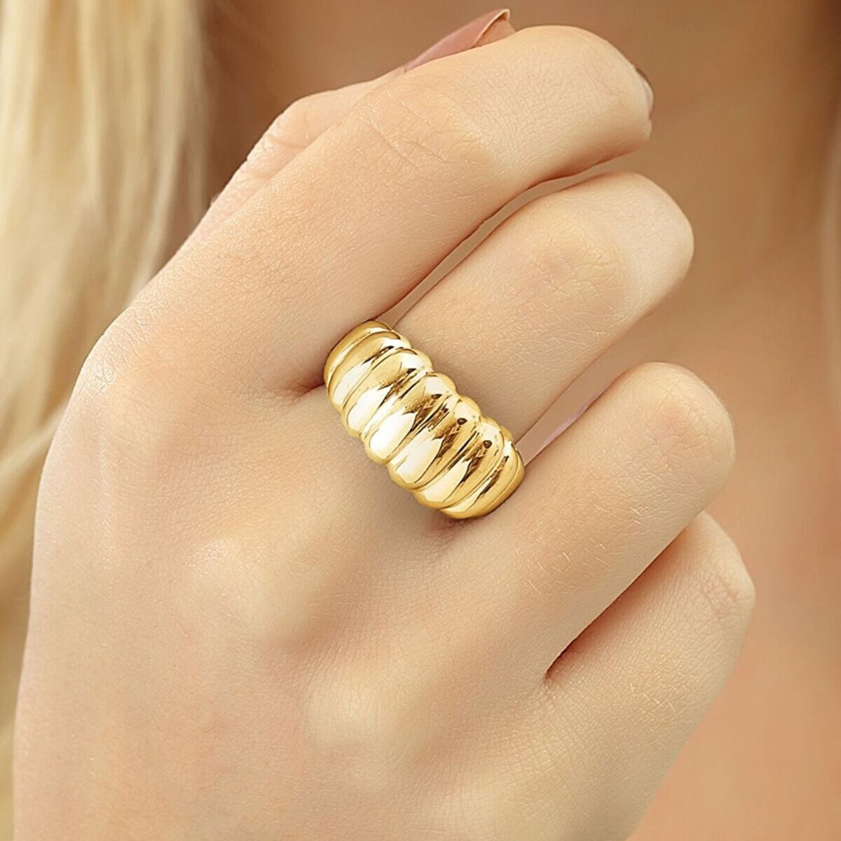 This Chunky Multi Dished Adjustable Statement Sterling Silver Croissant Ring Gold by Spero London is a playful twist on Parisian chic. Inspired by the croissant, its bold dome textures and smooth curves exude effortless elegance with a modern edge. Adjustable and versatile, it’s a statement piece that shines with whimsical sophistication.