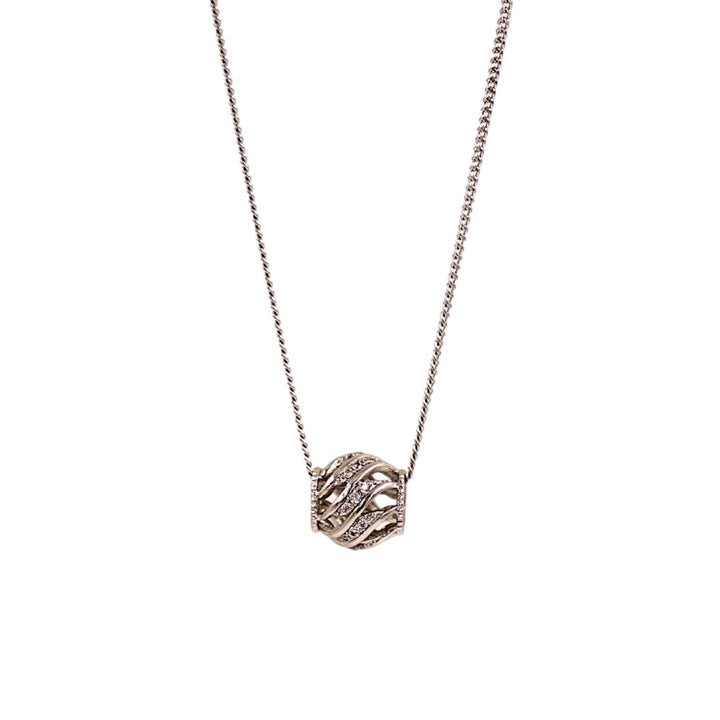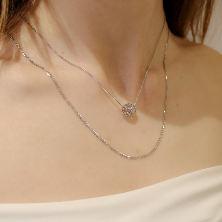 This necklace is made with a rhodium-plated chain and features Swarovski crystals. It is a single necklace.