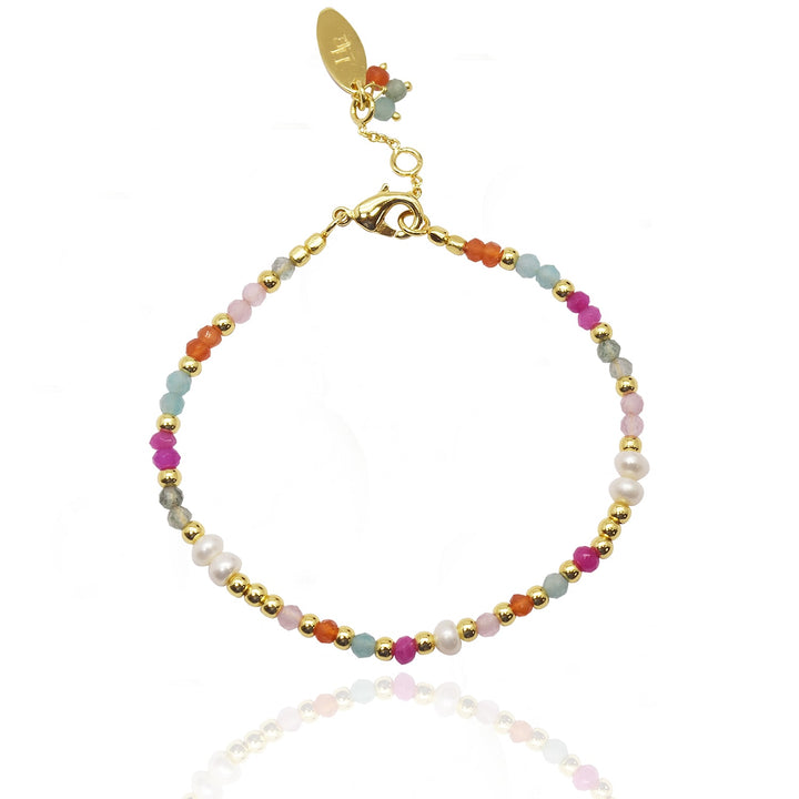 Gold-plated bracelet with semi-precious stones: green aventurine, rose quartz, amazonite, carnelian, and freshwater pearls.