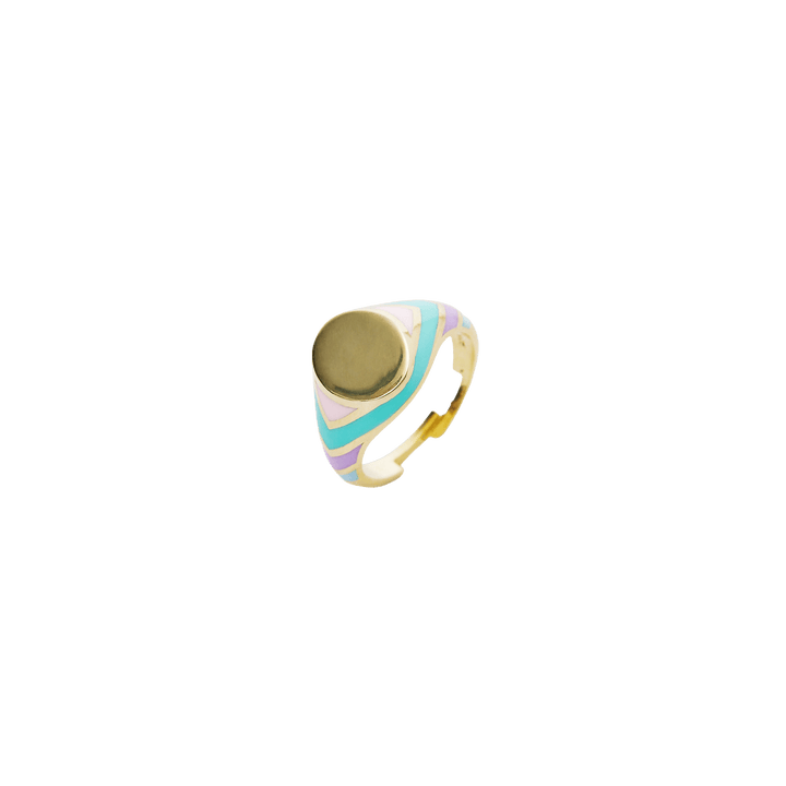 This adjustable signet ring is crafted from recycled 925 sterling silver with a gold-tone body. It features a gold-tone coin on top and a multicolored enameled band.
