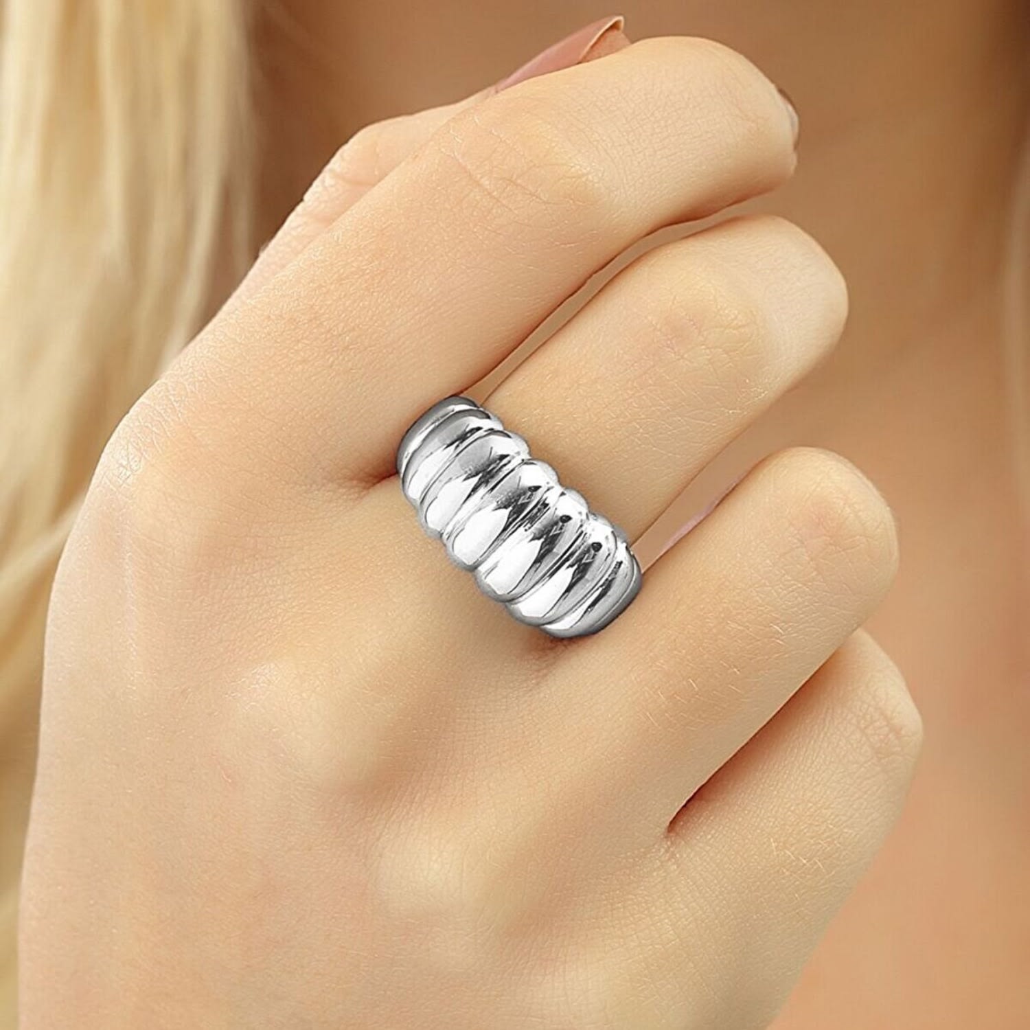 This Chunky Multi Dished Adjustable Statement Sterling Silver Croissant Ring by Spero London is bold and playful, inspired by the Parisian croissant. Its sculptural dome-like design wraps the finger in elegant curves, adding a trendy twist to classic silver jewellery. Adjustable and versatile, it’s a statement piece that feels as chic as it looks.