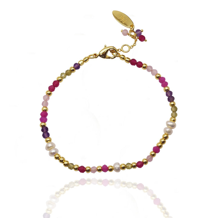 This bracelet is gold plated and features amethyst, pink jade, peridot, and freshwater pearls.