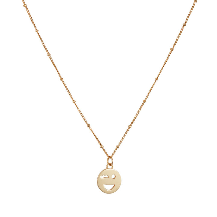This Mood Pendant Necklace Wink by Toolally is a playful fusion of pop culture and fine jewelry, designed to make you smile. This pendant, featuring a hand-enameled "Wink" design, hangs from a delicate satellite chain, allowing you to let your jewelry do the talking. It embodies a witty and whimsical charm, making it a unique accessory that reflects your mood and adds a touch of personality and sophisticated fun to any look.