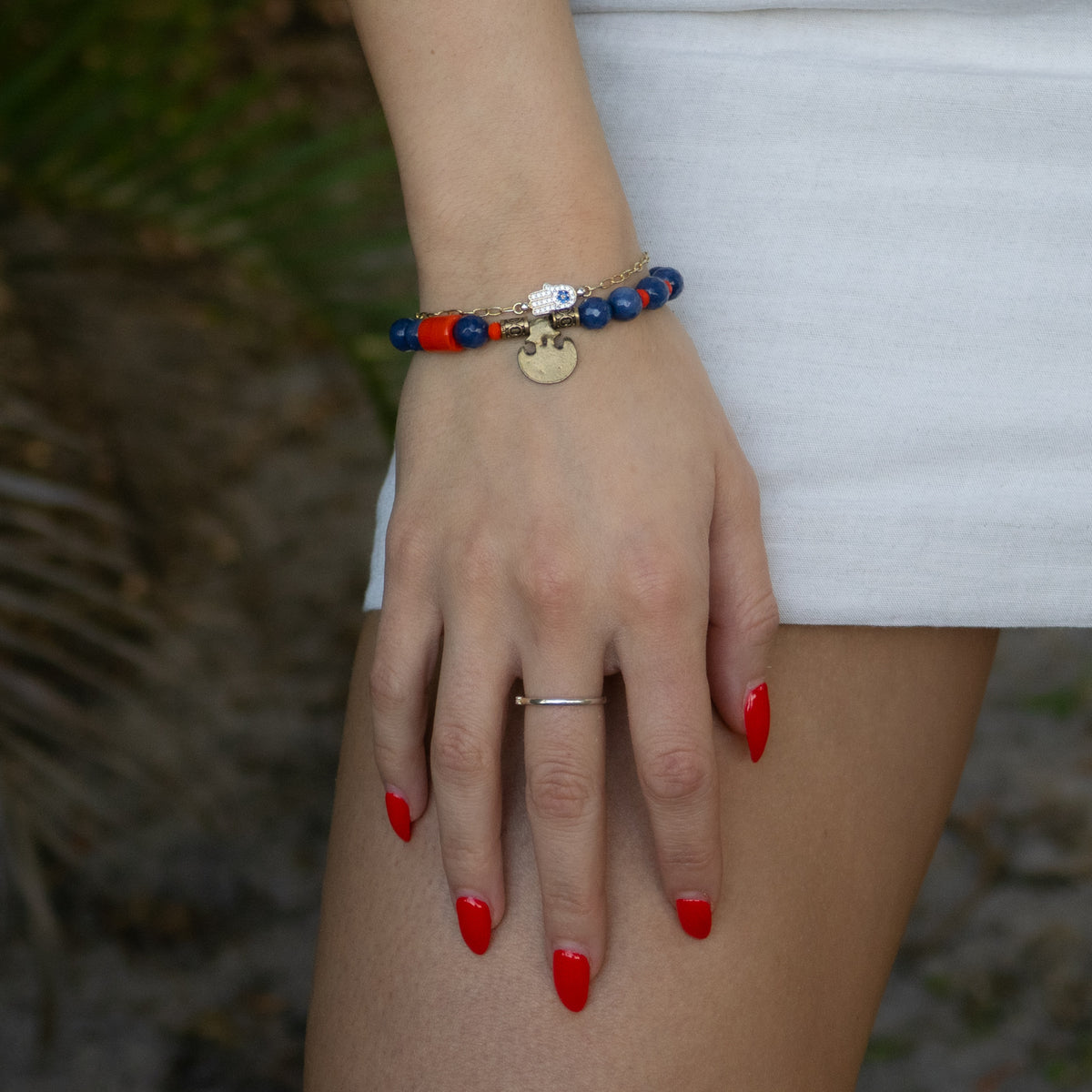 This handmade bracelet is made with blue agate stone beads, orange crystal beads, a large red bead, and bronze spacers and a charm. The bracelet size is 6.5".
