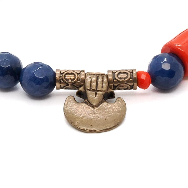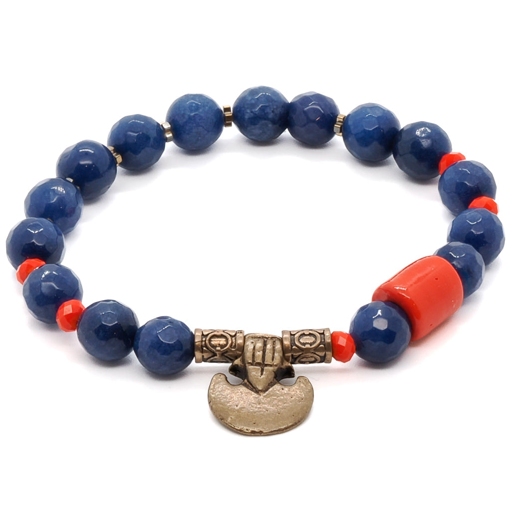 This Agate Stone And Bronze Charm Beaded Bracelet by Ebru Jewelry showcases a captivating and empowering design. It features a combination of blue agate stone beads, orange crystal beads, a large red bead, and bronze spacers and charm. The warm bronze tones add elegance and strength, while the vibrant stones exude energy and determination. This handmade bracelet is a bold statement piece that adds a touch of confidence to any outfit.
