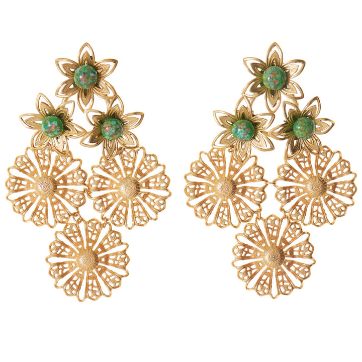 These Dahlia Earrings In Olive by Castlecliff are statement florals reimagined in vintage elegance. A bouquet of delicate filigree flowers cascades from lace-like filigree discs, accented by vintage olive-coloured stones. Romantic and artisanal, they recall Casa Azul’s moody beauty and celebrate craftsmanship rooted in history. Perfect for those who adore bold, unique jewellery with a story.