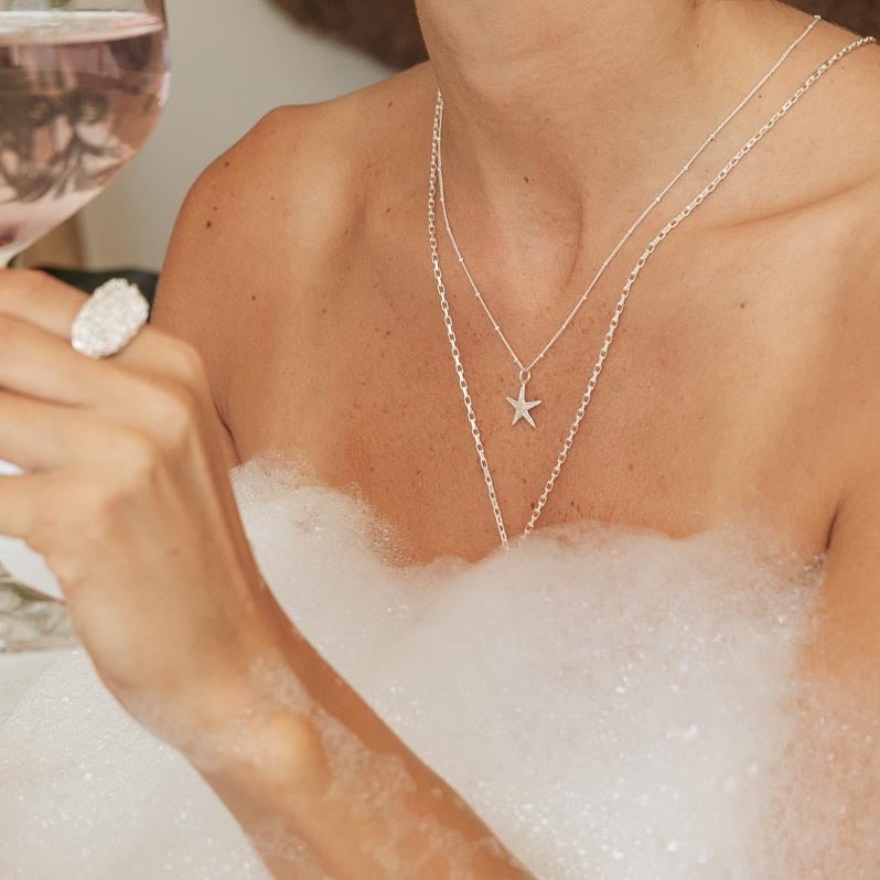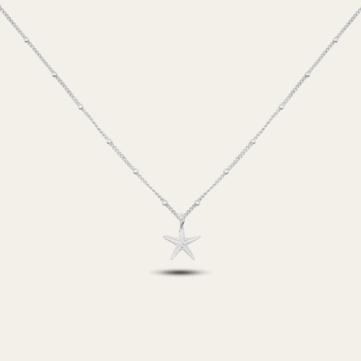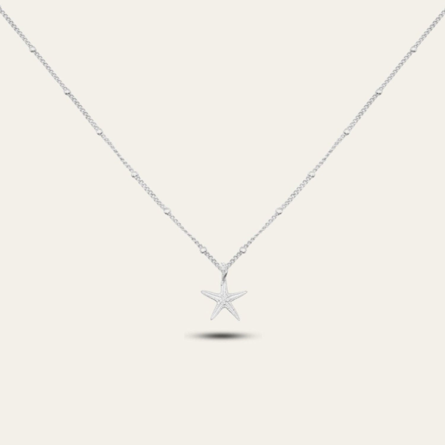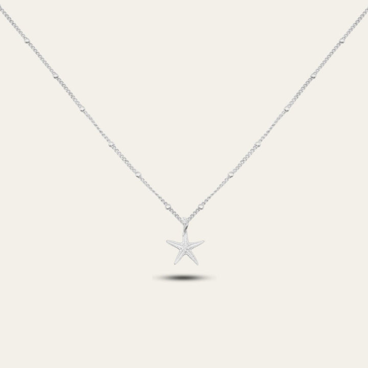 Handmade from recycled sterling silver, this necklace features a 1cm starfish pendant with intricate detailing. The 18-inch chain is secured with a fastening that includes a 9ct gold star. The piece comes with a gift box and a polishing cloth.