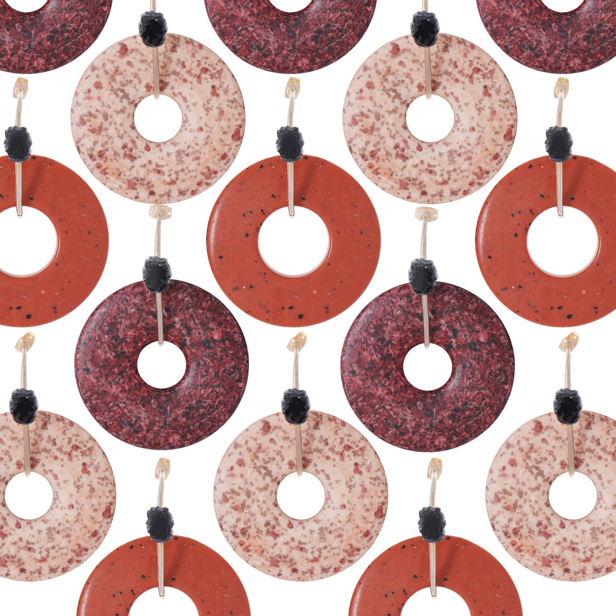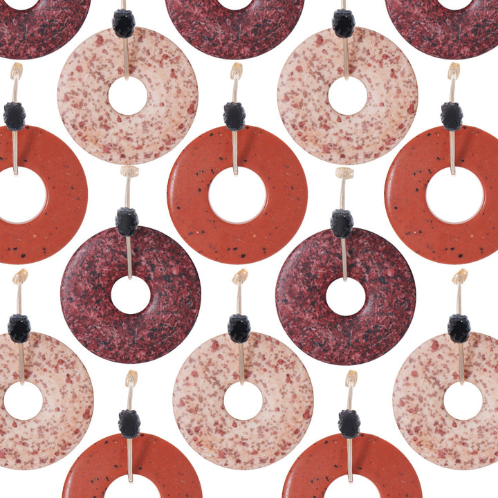 These earrings are made from 100% recycled brass, a vintage glass agate stone, and an upcycled speckled resin disc. They are finished with a sterling silver post and are handmade in NYC.