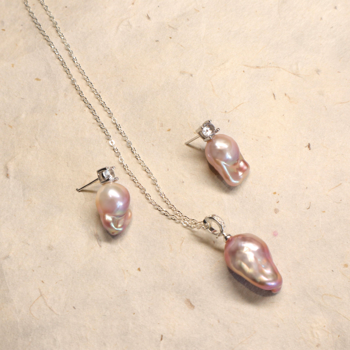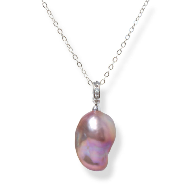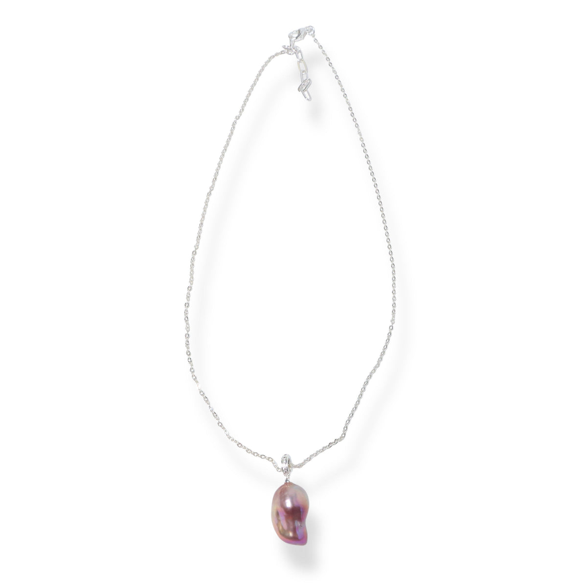 This necklace is made from 925 silver. It features a natural pink short-tail baroque pearl and a 5A-grade zircon.