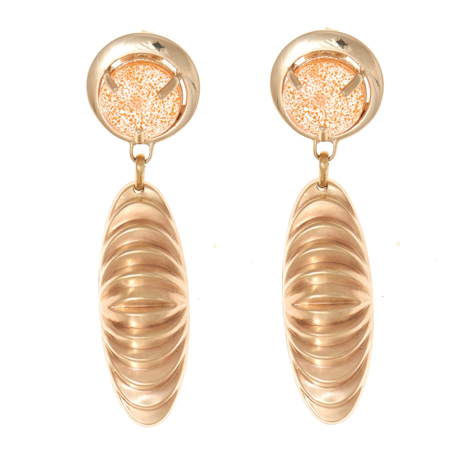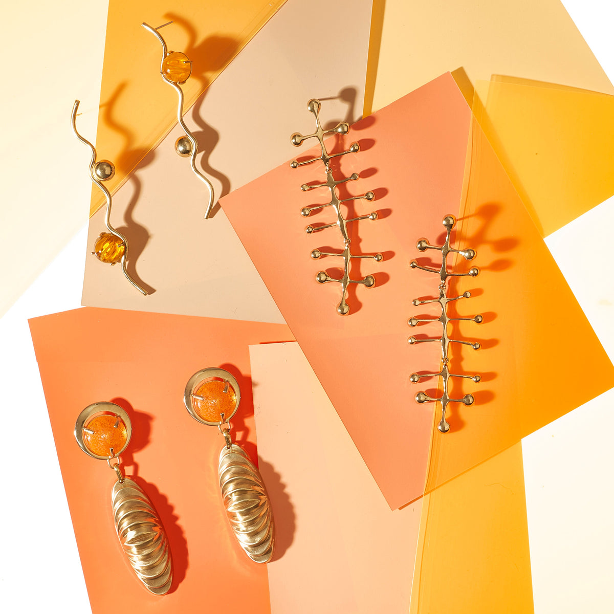 These Camille Earrings in Speckled Orange by Castlecliff are vibrant and artistic, inspired by the bold forms of the Memphis Movement. Vintage brass and glass elements combine in a playful, sculptural design that makes a daring statement. Handmade in NYC, they are modern heirlooms celebrating sustainability and creativity.