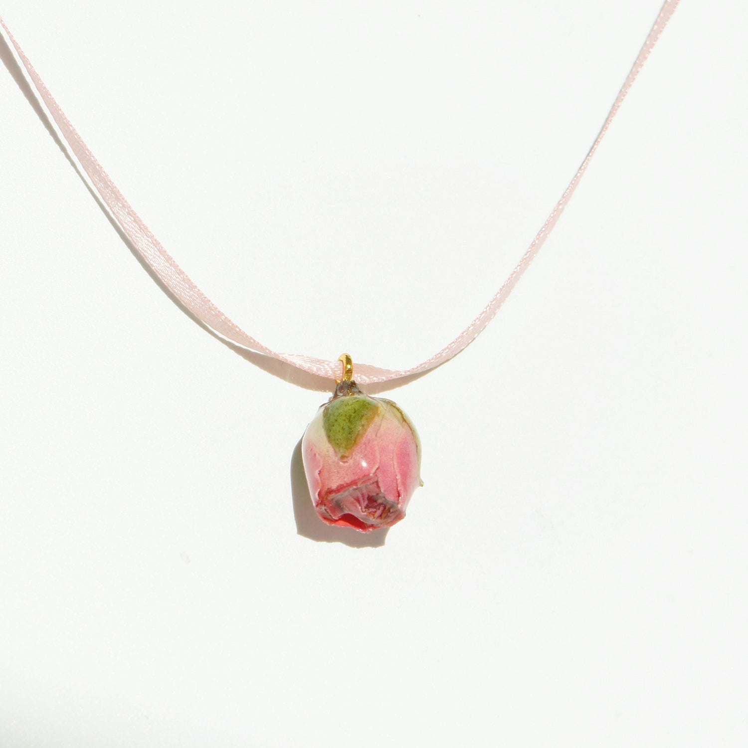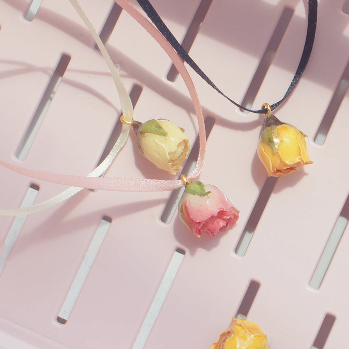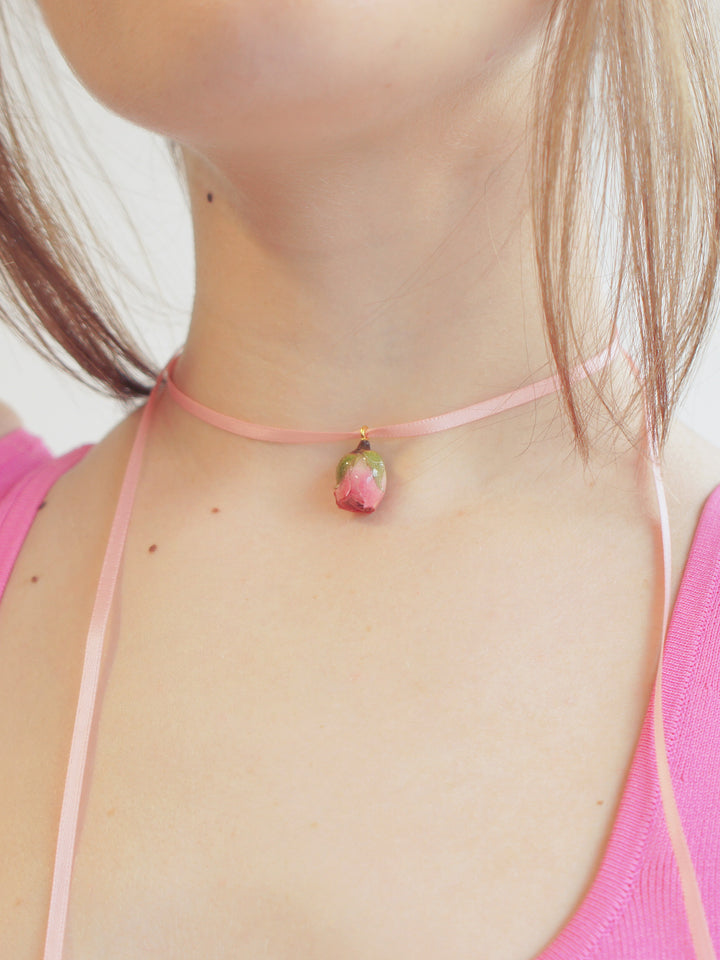 Real Flower Bella Rosa Pink Satin Ribbon Choker With Rosebud Pendant