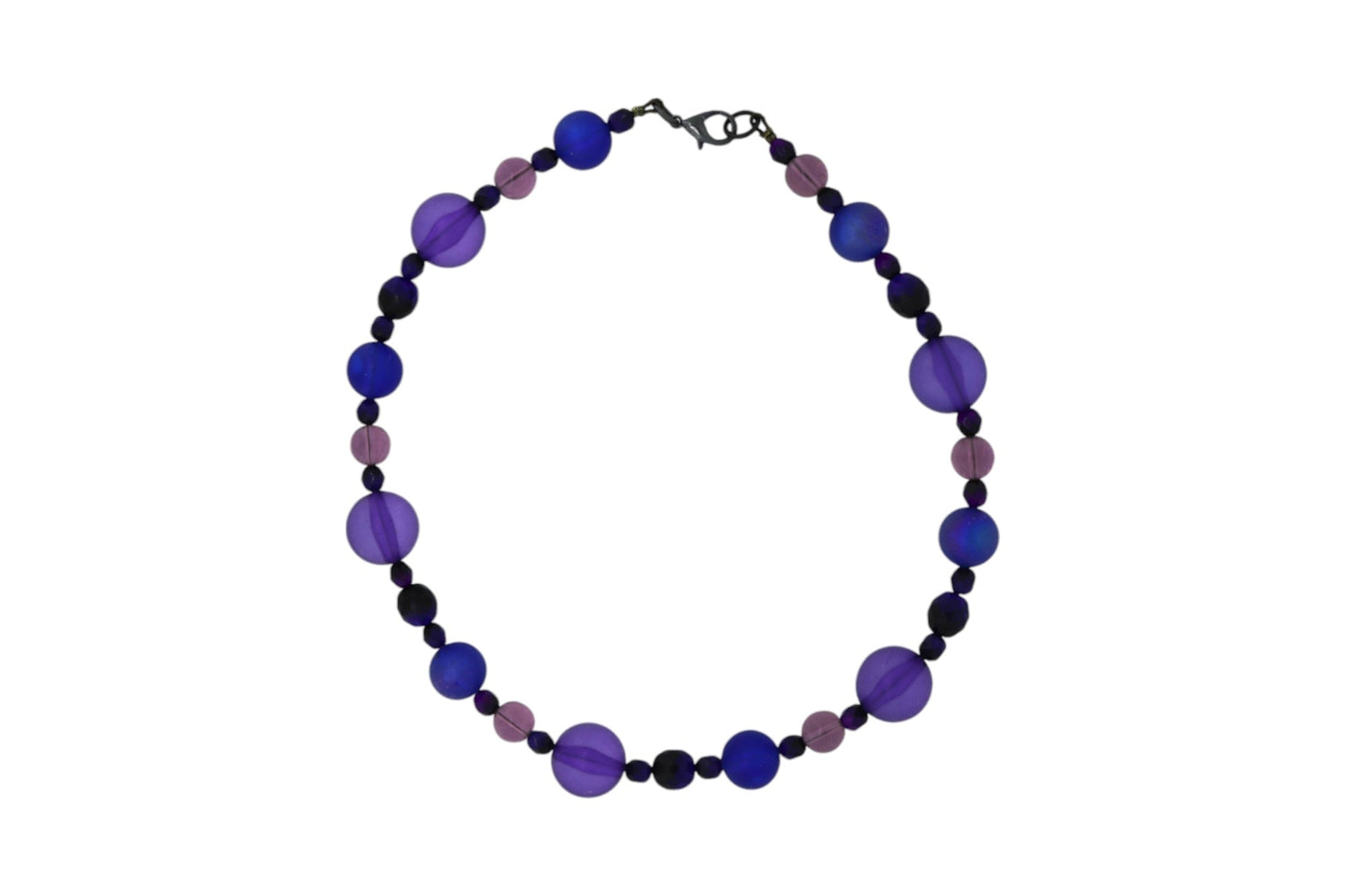 This necklace is handcrafted with vintage wooden, glass, and theatre beads and an Oxidised Sterling Silver plated clasp. It is a short, jumbo bubble style necklace.