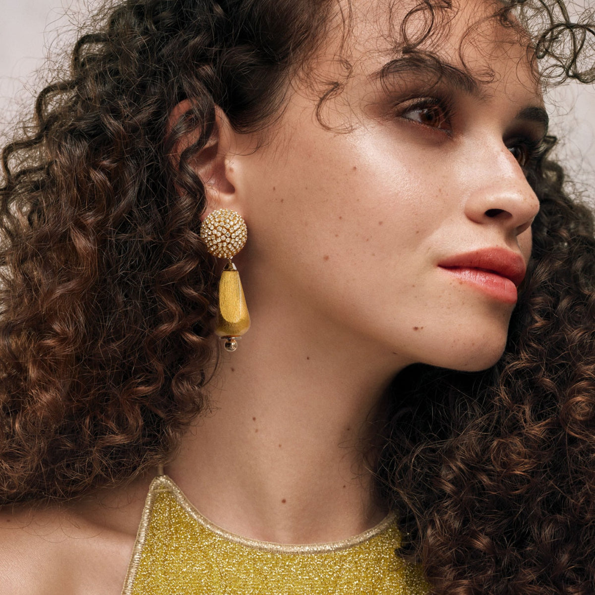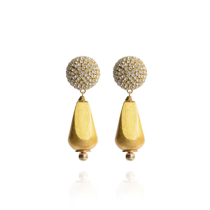 These Dalia Earrings In Gilded Gold by Saule Label are a luxurious and elegant accessory. They feature a crystal rhinestone statement stud on an upcycled vegan leather backing with a glass bead trim. A lightweight wood drop, painted with 24K gold foil, hangs below, finished with a petite hematite bead. Handmade in Detroit with 18K gold plated brass hardware, these earrings provide strong shine and classic glamour.