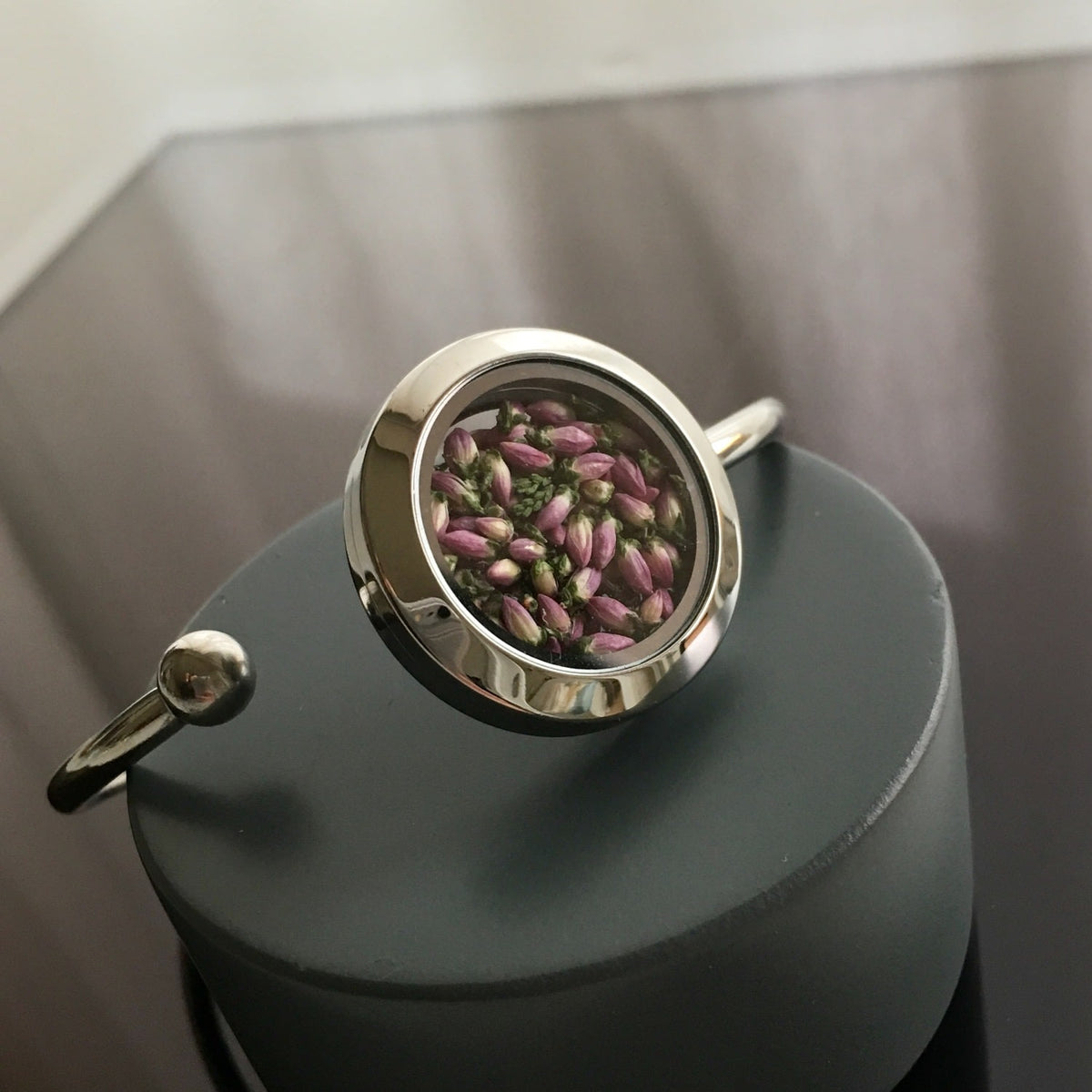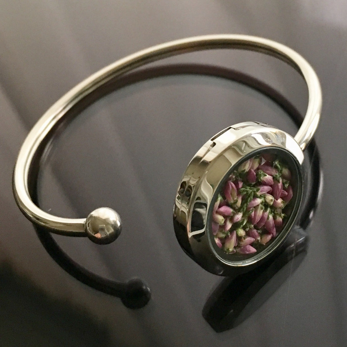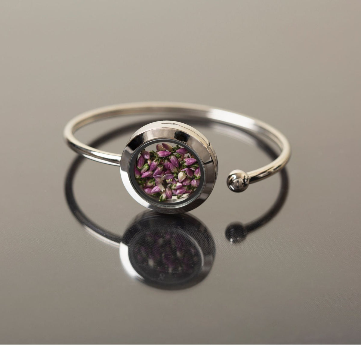 This bracelet is made from stainless steel and glass, and features natural Scottish heather blossoms.