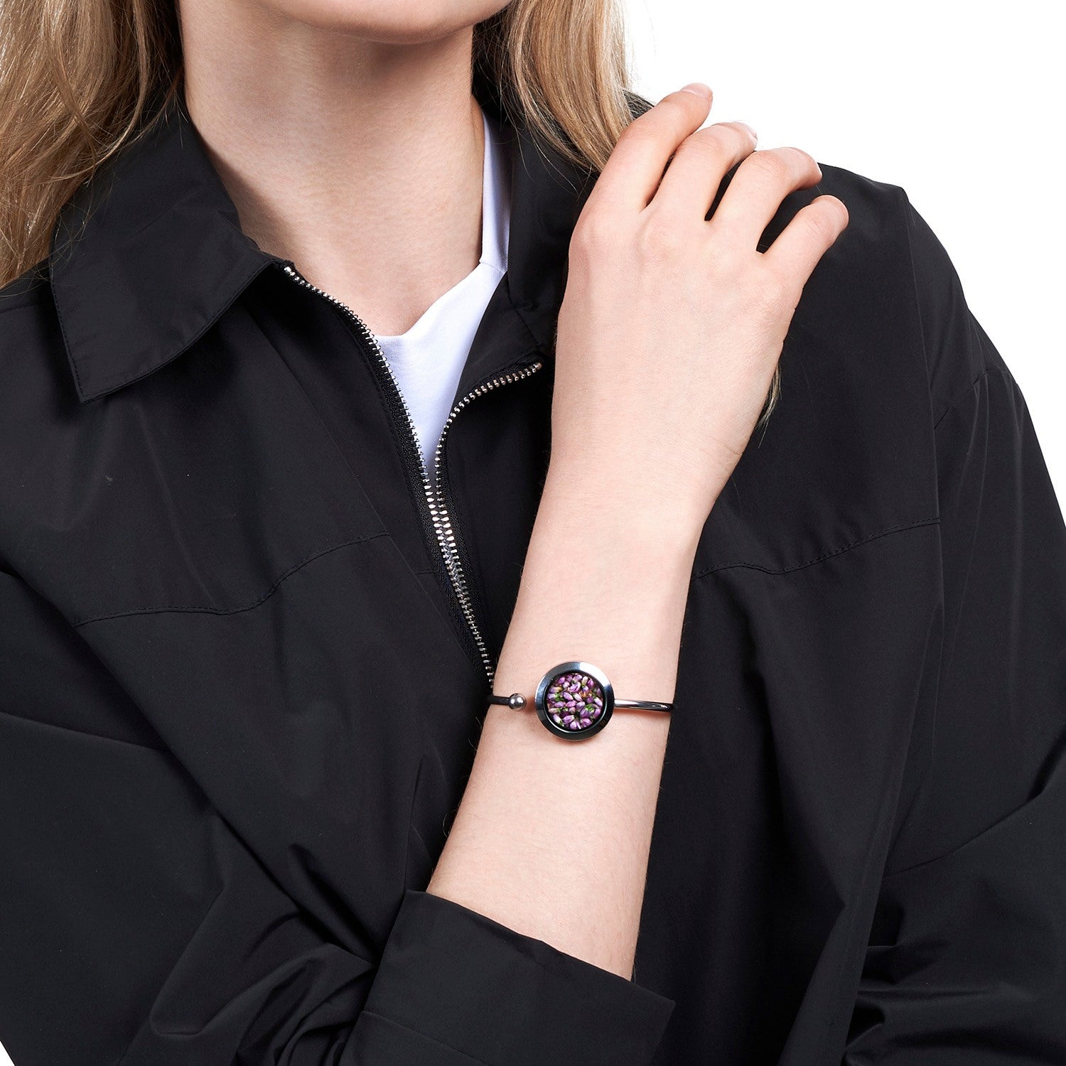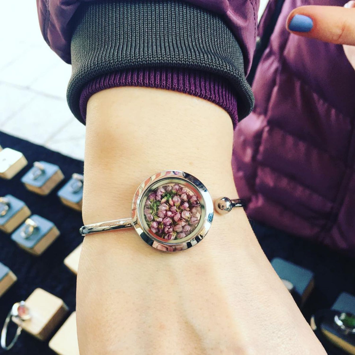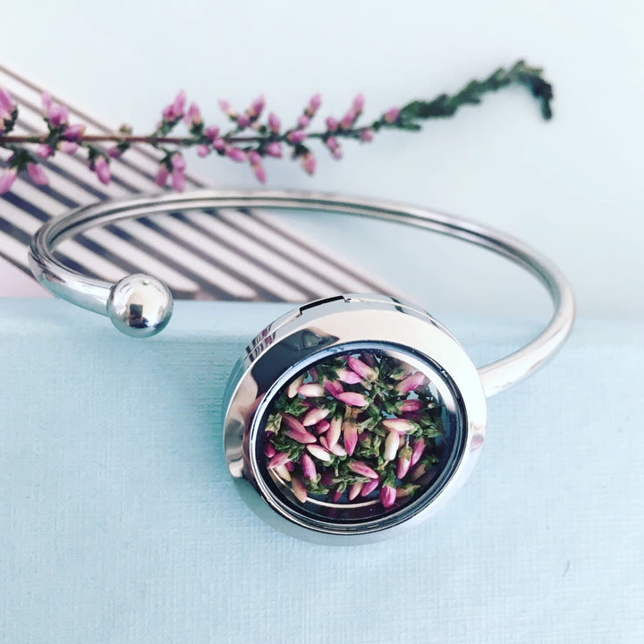 This bracelet is made from stainless steel and glass, and features natural Scottish heather blossoms.