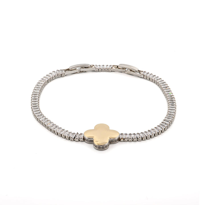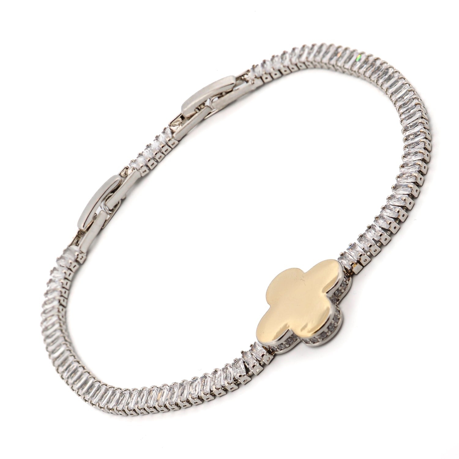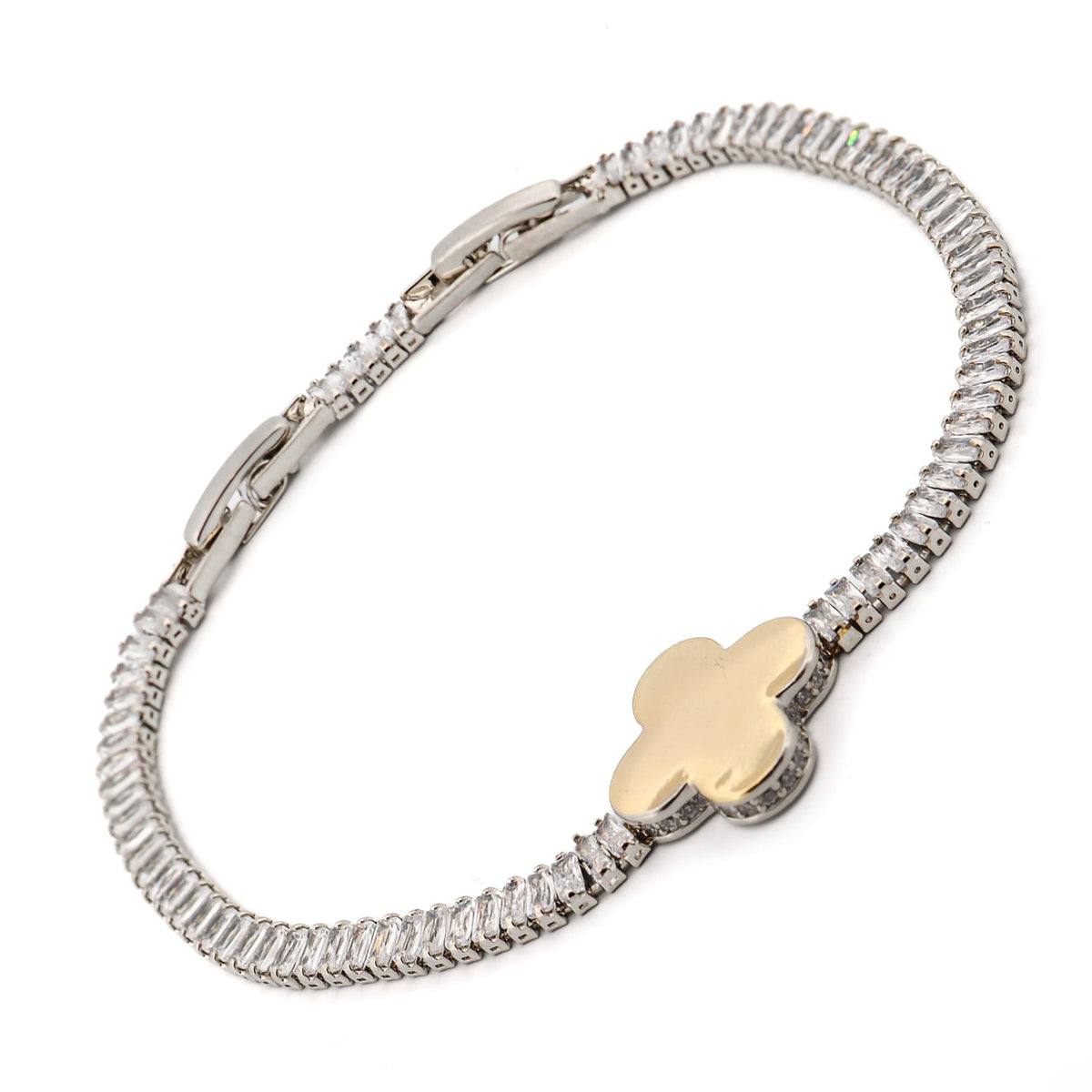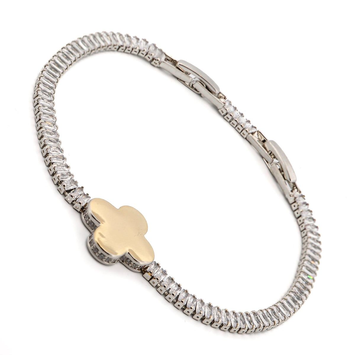 This bracelet is made with white gold plated on brass. It features a baguette style Cz Diamonds chain and a gold-plated clover charm. The adjustable size is 6.25'' - 7.5''.