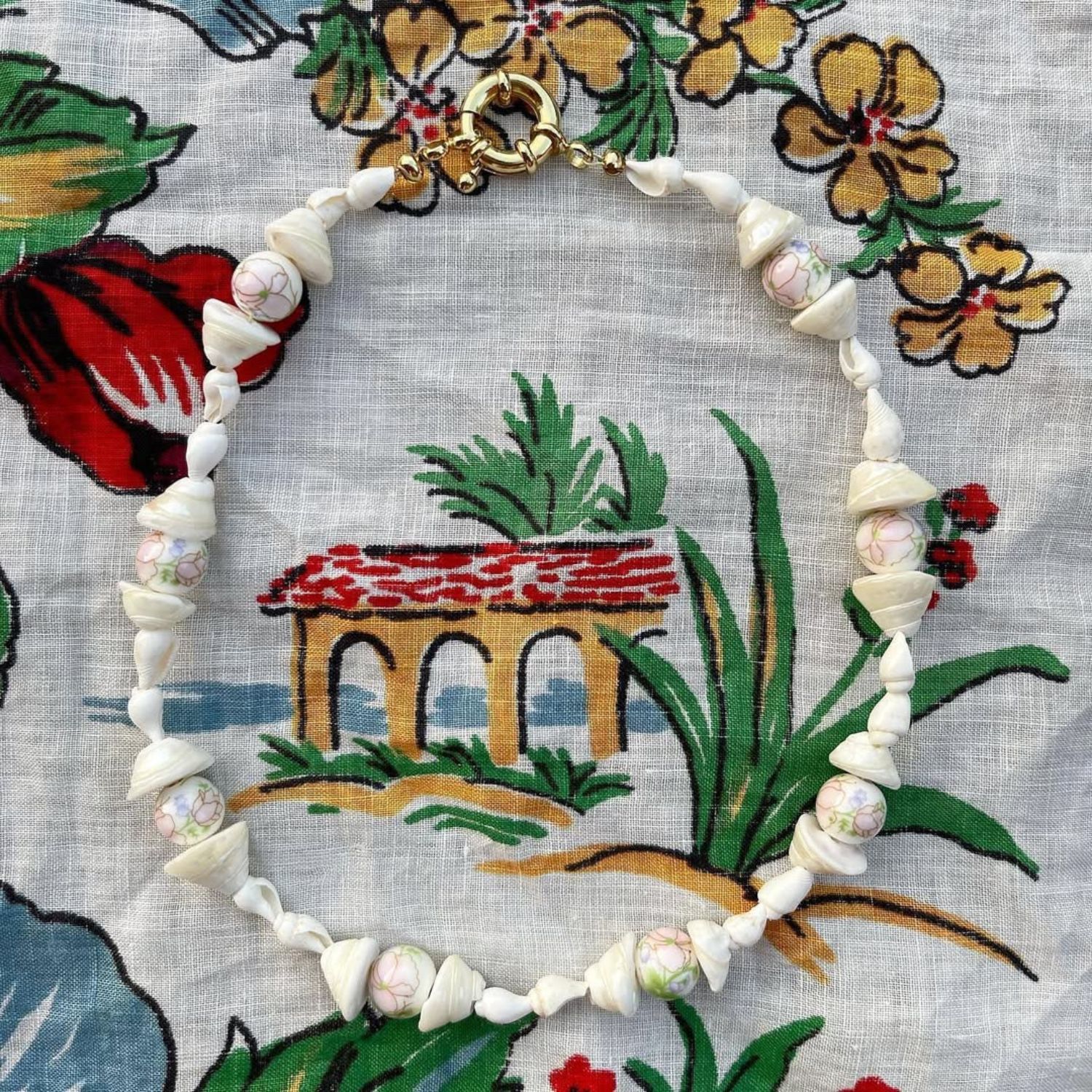 This necklace features natural shell beads and lustrous cultured freshwater pearls. It has a 16" length and an 18K gold-plated spring ring clasp.