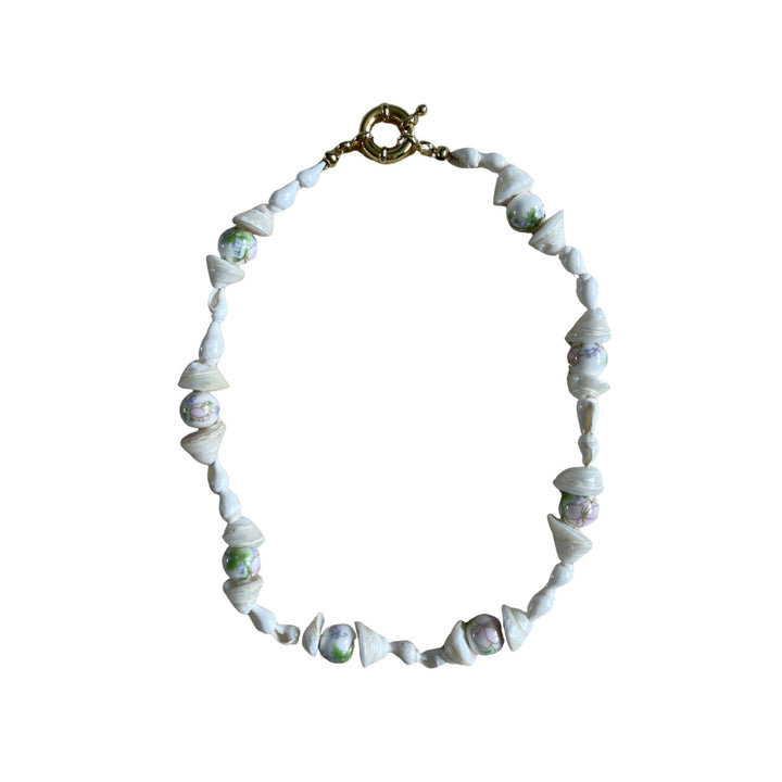 Valley Girl Necklace by Miss May the Brand is a harmonious blend of natural beauty and elegance. This necklace features a beautiful combination of natural shell beads and lustrous cultured freshwater pearls, creating a unique balance of textures. With an 18K gold-plated spring ring clasp, it is both durable and stylish. Each piece is unique due to the careful hand selection of each bead, making it a sophisticated and one-of-a-kind accessory.