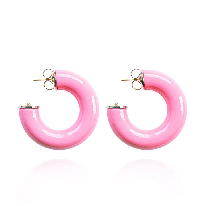 The Alba Hoops by Saule Label in Taffy are bold statement earrings with a smooth, rounded silhouette and a high-shine finish. They are surprisingly lightweight and designed to elevate any outfit with minimal effort. They are hand-painted with non-toxic paints on a wood base and have 18K gold-plated hardware and stainless steel posts.
