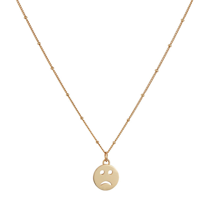 This Mood Pendant Necklace Sad by Toolally is a playful fusion of pop culture and fine jewelry, designed to make you smile. This pendant, featuring a hand-enameled "Sad" design, hangs from a delicate satellite chain, allowing you to let your jewelry do the talking. It embodies a witty and whimsical charm, making it a unique accessory that reflects your mood and adds a touch of personality and sophisticated fun to any look.