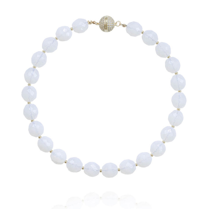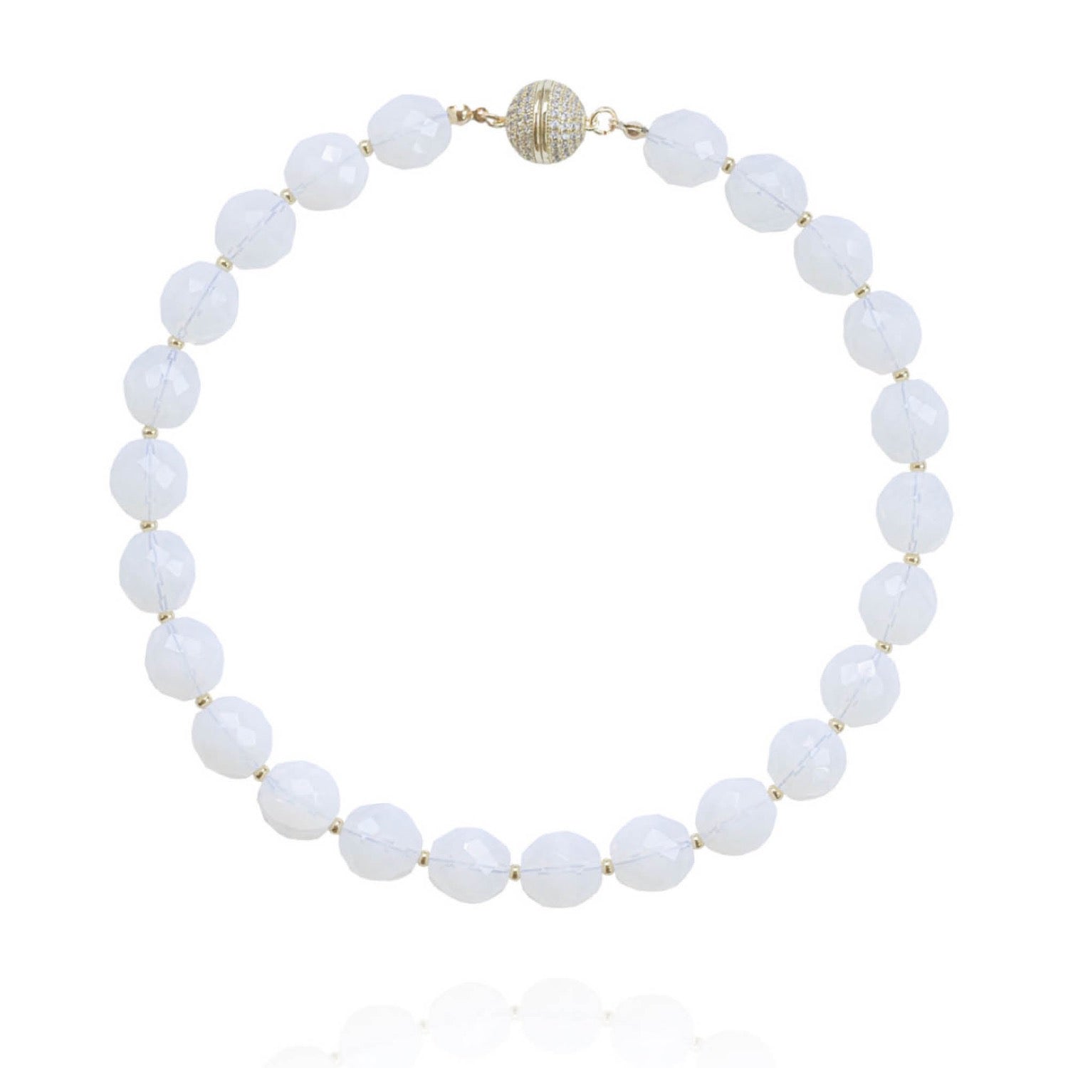 The Leni Grande Necklace in Moonstone by Saule Label is a dramatic and bold statement choker. It features oversized faceted Czech Glass Beads and a pavé crystal magnetic clasp. This necklace is all polish and no distractions, with a striking, sculptural silhouette that can be worn alone or stacked. The clasp can be worn in the front or back, adding versatility to this glossy and unforgettable piece.