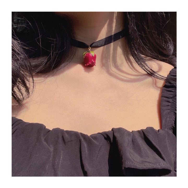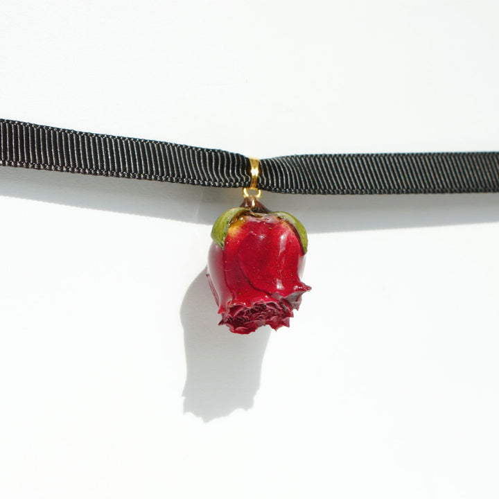 Real Flower Grande Amore Rosebud Black Ribbon Choker Necklace