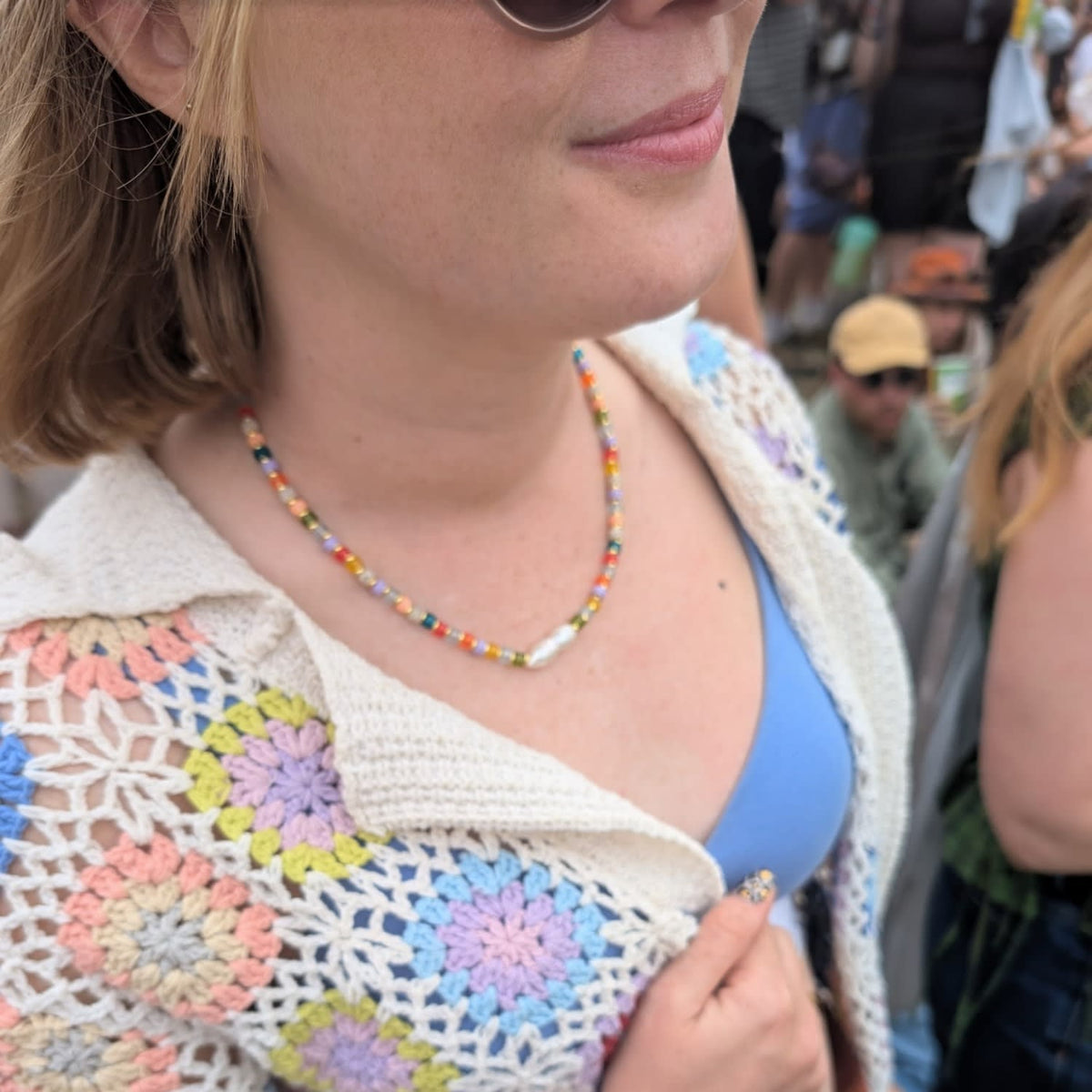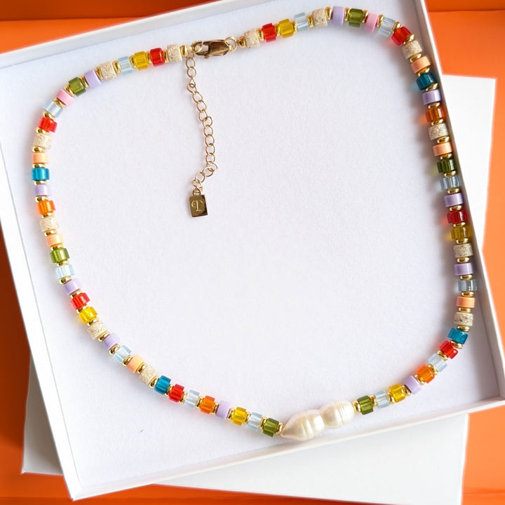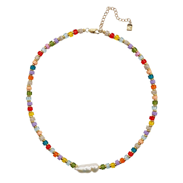 The Beaded Necklace - Rainbow & Pearl by Toolally is a dazzling and fun accessory that is perfect for summer. It is made with shimmering freshwater pearls and studio-cut colored acrylic discs, creating a beautiful kaleidoscope of color. This necklace is designed to turn heads and can be worn solo or teamed with matching accessories for a vibrant, coordinated look.