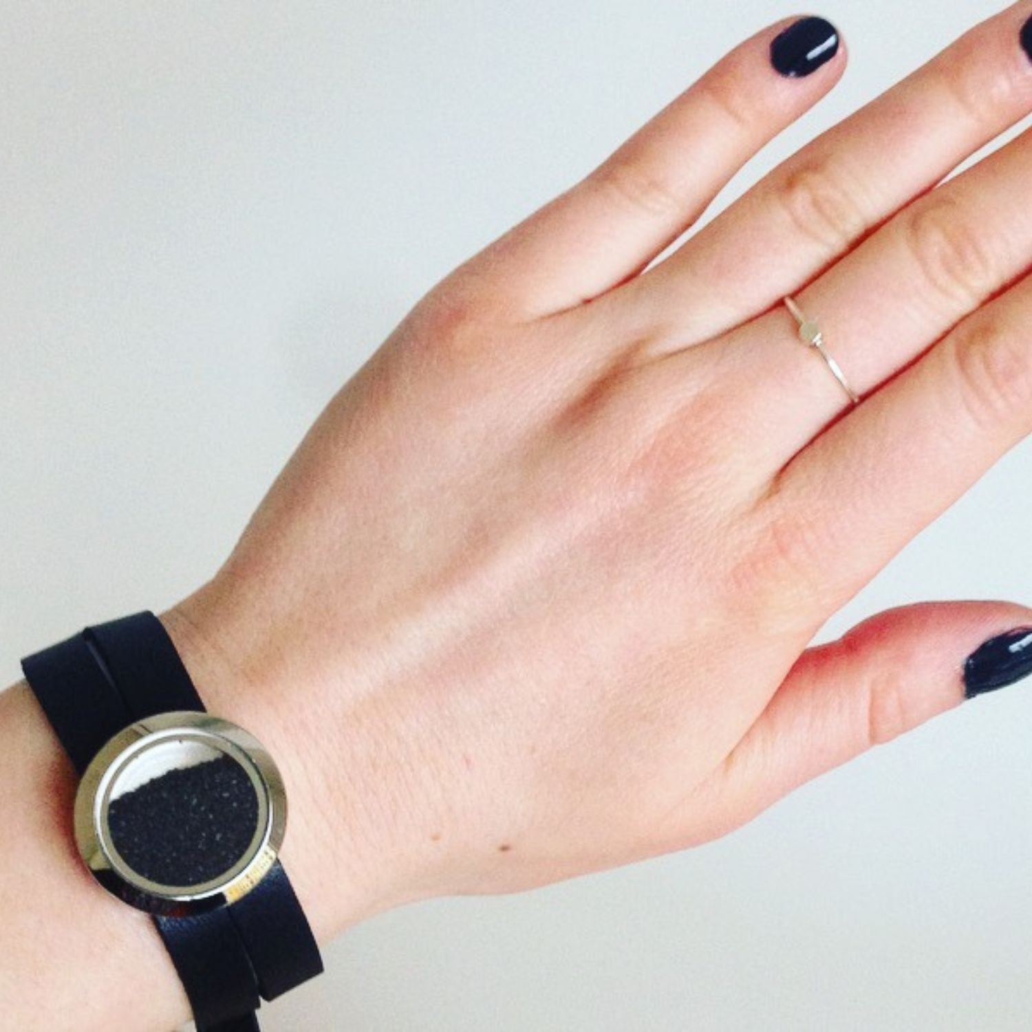 Leather band. Stainless steel clasp. Natural volcanic sand accents.