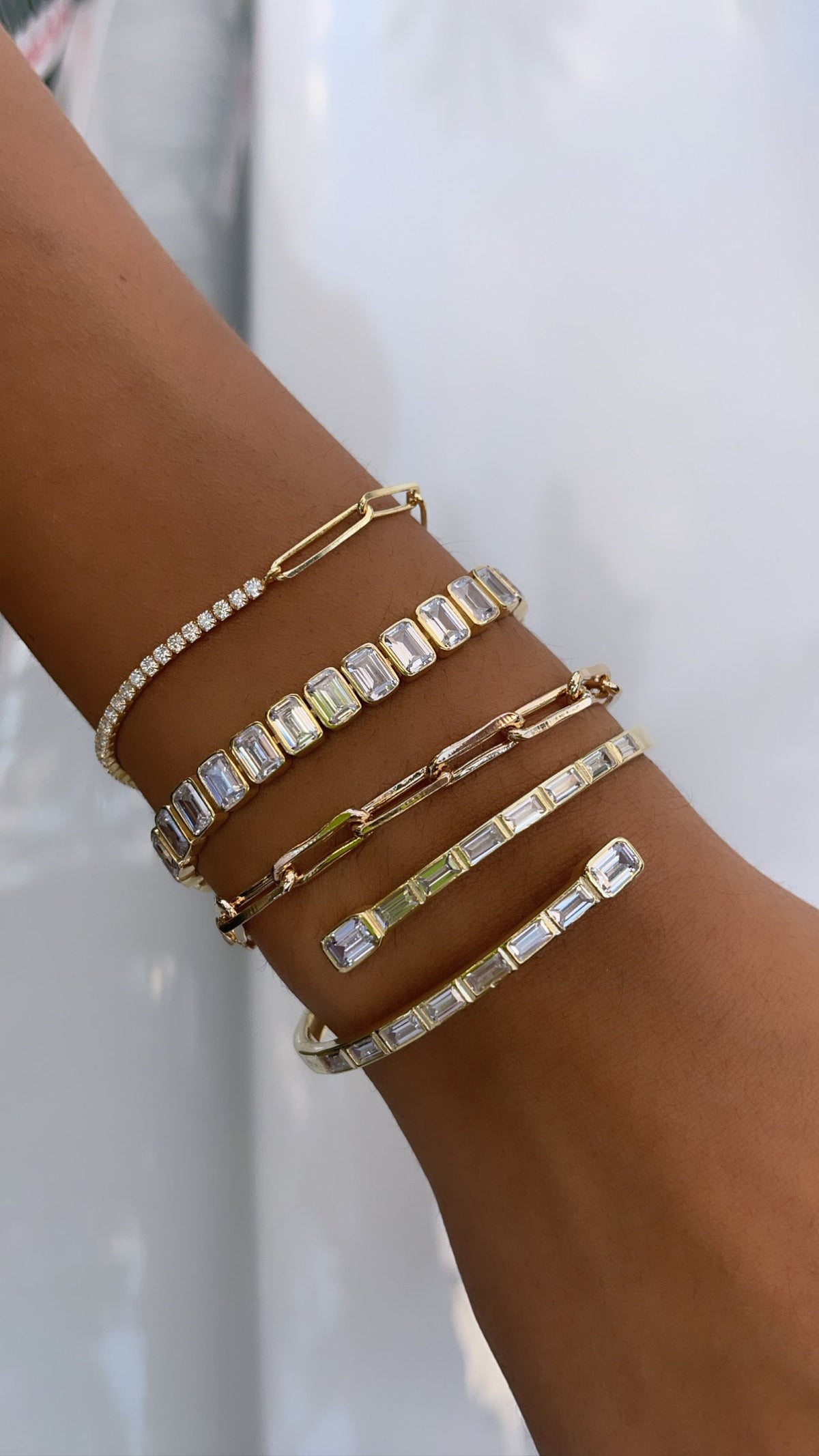This bangle is crafted from .925 sterling silver with 14k gold plating and is set with cubic zirconia baguette stones. It has a one-size-fits-most design with a hinge closure.