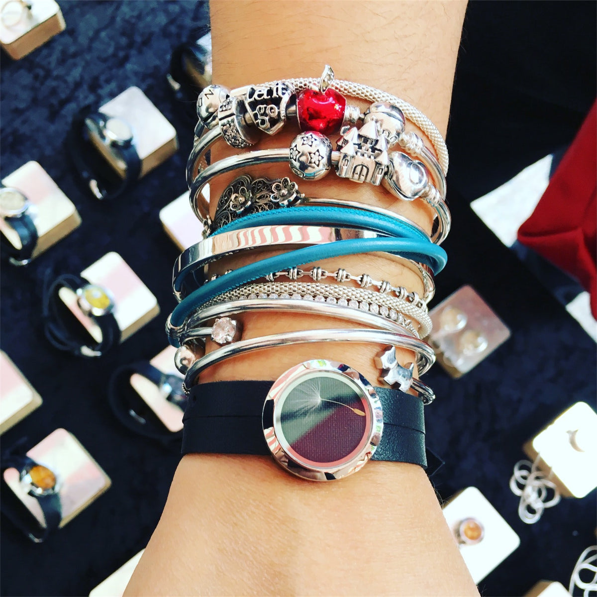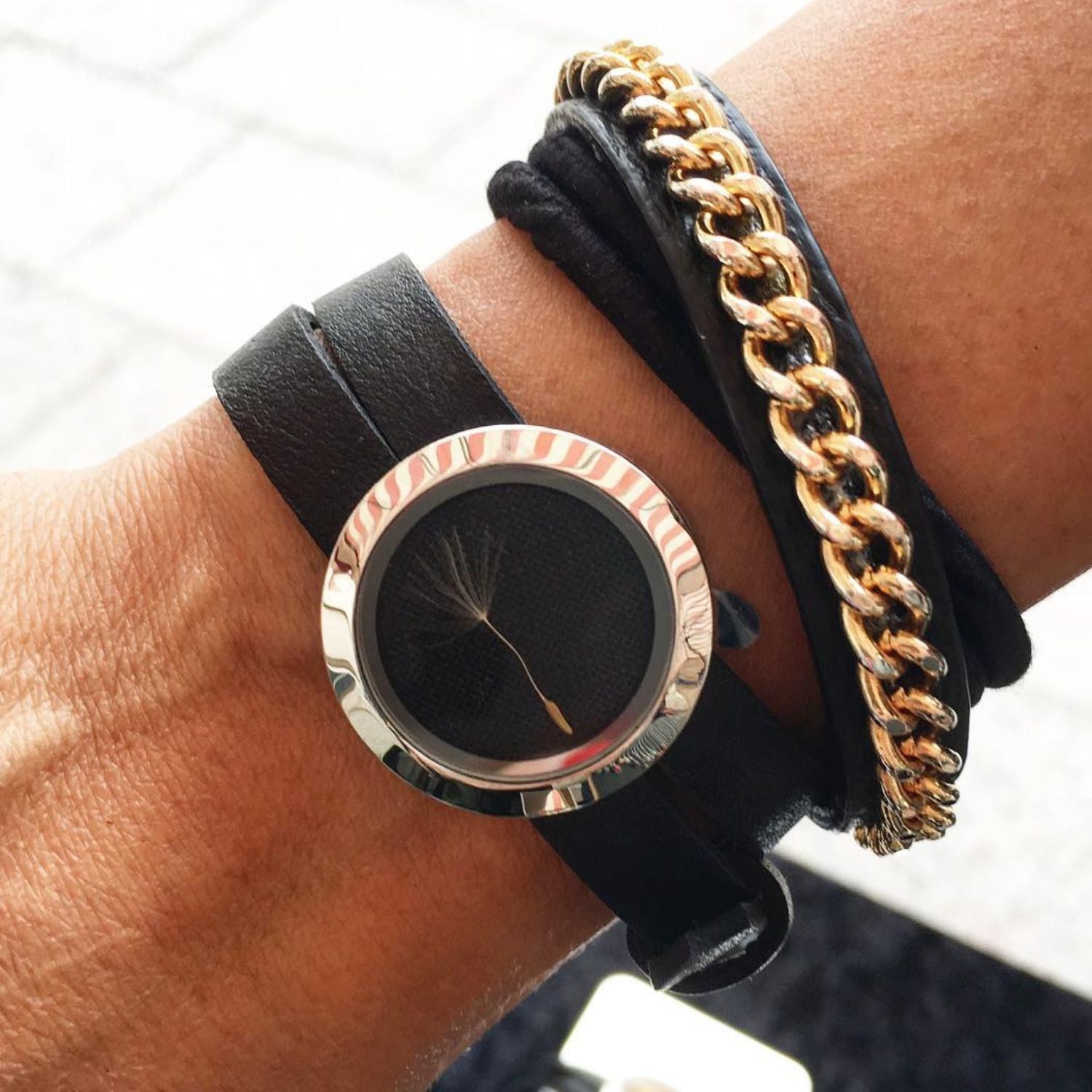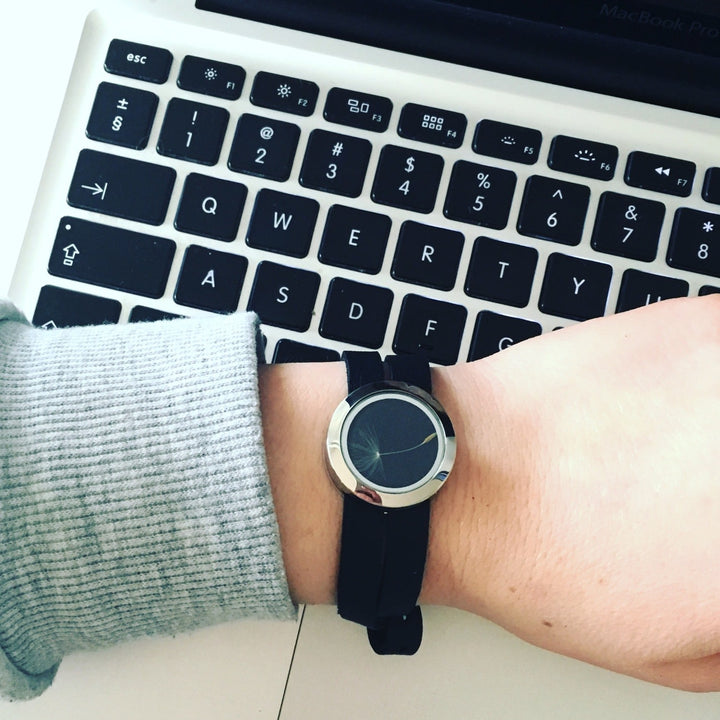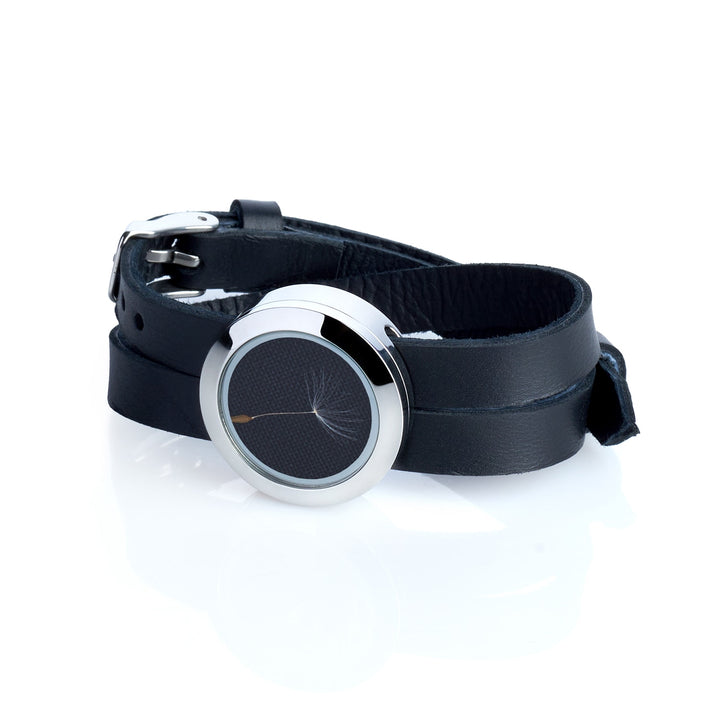 Leather, stainless steel, and natural dandelion seeds in glass. Handmade with care.