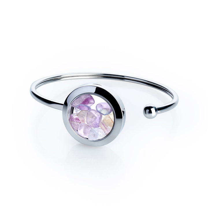 Stainless steel cuff. Natural fluorite gemstone. Adjustable fit. Hypoallergenic and tarnish-resistant.