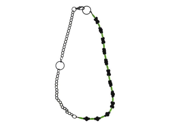 This necklace is handcrafted with vintage beads and an oxidized sterling silver-plated clasp and chain. It features a scary skull charm.