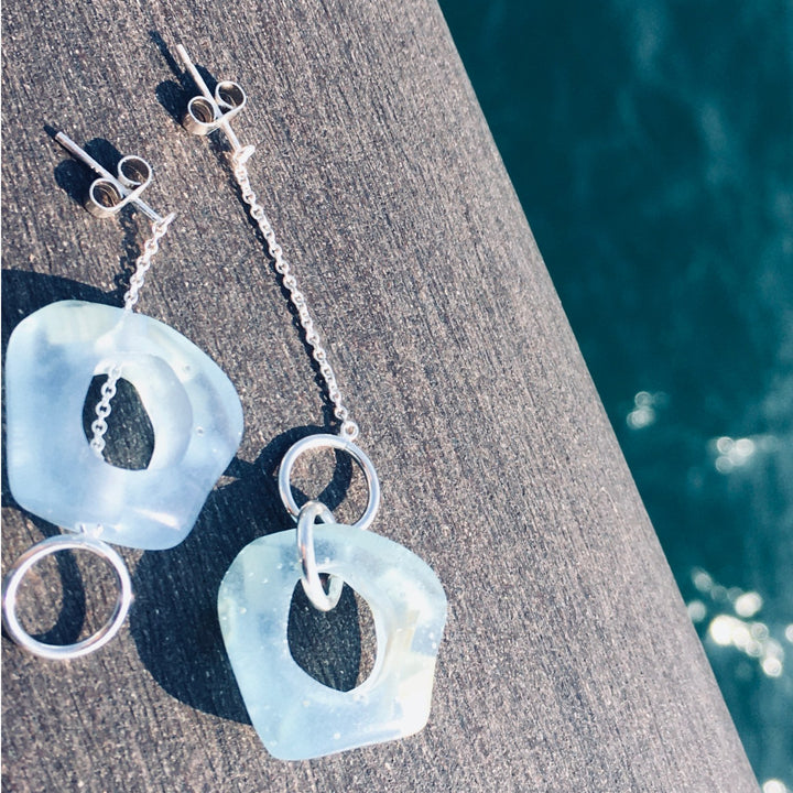 These drop earrings are handmade in London from recycled sterling silver. They feature Bio-Gems that are uniquely formed from plant fibers.