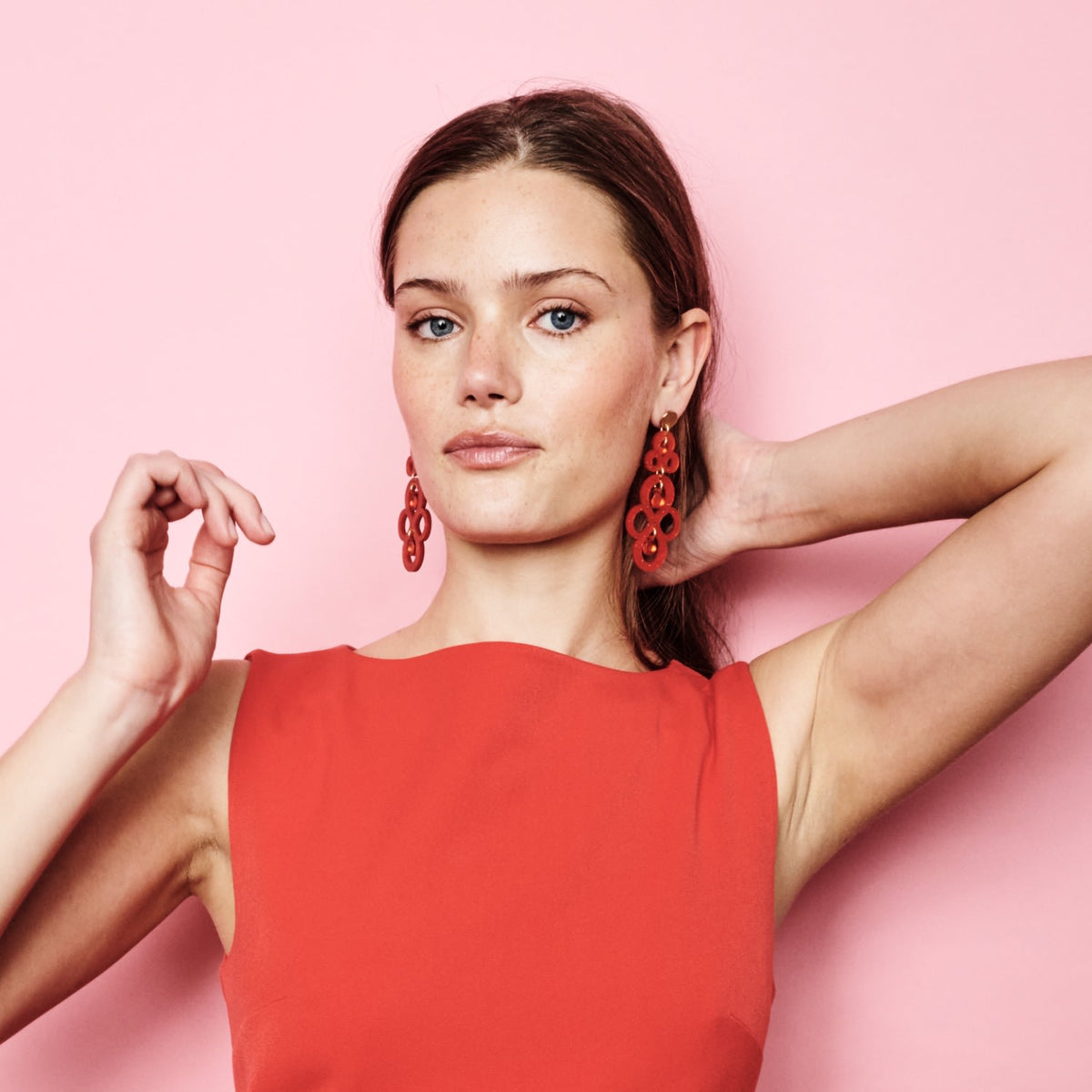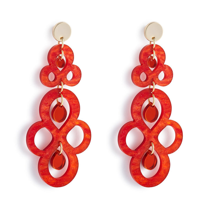 These drop earrings are made from hot Sienna Red acrylic and feature six drops of orange mirror. They hang from a post of sterling silver plated with 3 microns of 18k gold.