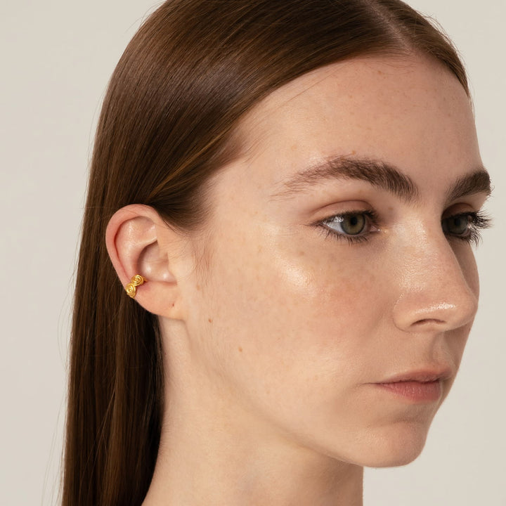 This Origin Ear Cuff in Gold by Eva Remenyi is a refined yet distinctive accessory. As the smallest piece in the collection, its design allows it to fit perfectly on the upper rim of the ear. This spectacular ear cuff can be worn on its own for a subtle statement or stacked with other cuffs for a truly bold and extravagant look, adding a touch of modern luxury to your style.
