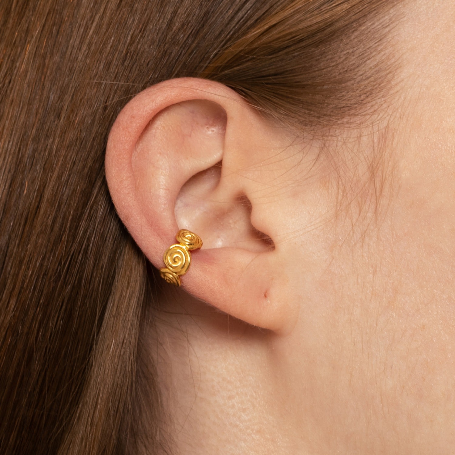 This ear cuff is handcrafted from 24k gold-plated brass with a 1-micron plating. It is nickel-free.