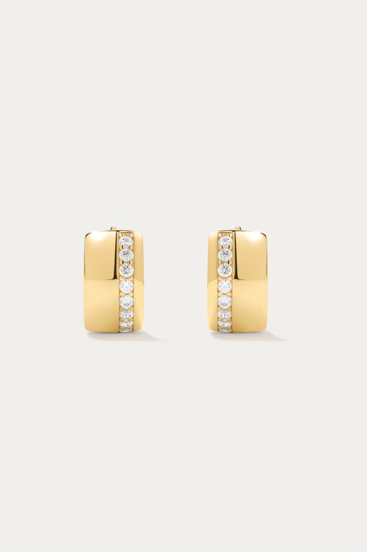 These Juni Pavé Chunky Huggie Earrings In Gold by Vanchi are a classic, versatile staple for any jewellery collection. Featuring clear 5A rated crystals set in a narrow recessed stripe within an 18k gold plating, these earrings are designed to be a perfect touch for both everyday looks and special occasions. Their chunky yet comfortable design and secure clicker closure make them ideal for all-day wear, and they are perfect for stacking to create a personalized ear party.