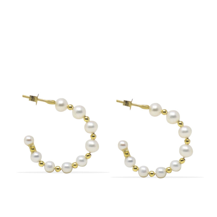 These hoop earrings are cast from 18 karat gold over sterling silver (1 micron thickness). They are strung with lustrous freshwater pearls and bright gold beads. The jewelry is nickel-free.