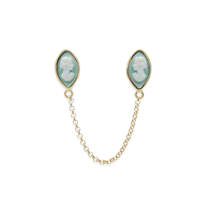 The Little Lovelies Gold-Plated Green Cameo Single Earring by Vintouch is designed to be worn in a double piercing, creating a stacked look with a single earring. It is handcrafted in Italy and features two dainty green cameos connected by a delicate chain.