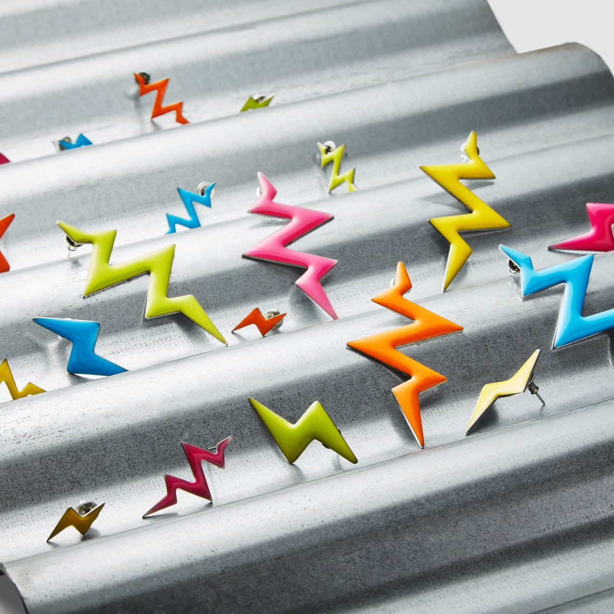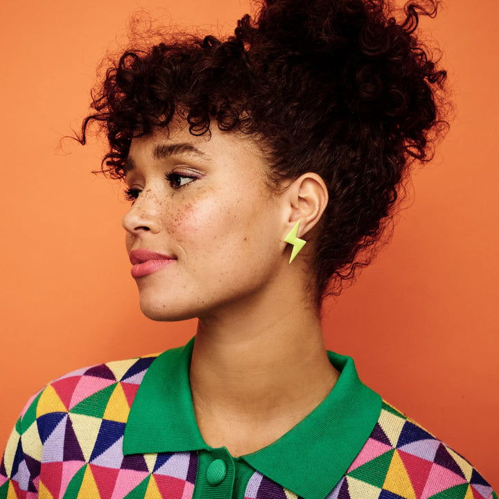 These Bolts - Yellow Enamel by Toolally are a bold and striking accessory. These studs are made from dark stainless steel and coated with bright yellow enamel, creating a powerful contrast. Their lightning bolt design adds a touch of edgy, rock-and-roll style to your look. Lightweight and versatile, they are perfect for adding a pop of color and personality, especially for the party season.