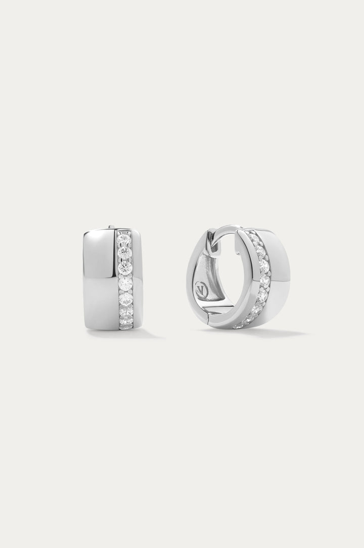 These Juni Pavé Chunky Huggie Earrings In Silver by Vanchi are perfect for everyday wear. These classic huggie earrings feature clear 5A-rated crystals in a narrow recessed stripe set in sterling silver. They are super comfy and stack like a dream. Finished with a clicker closure, they provide maximum comfort and security all day long.