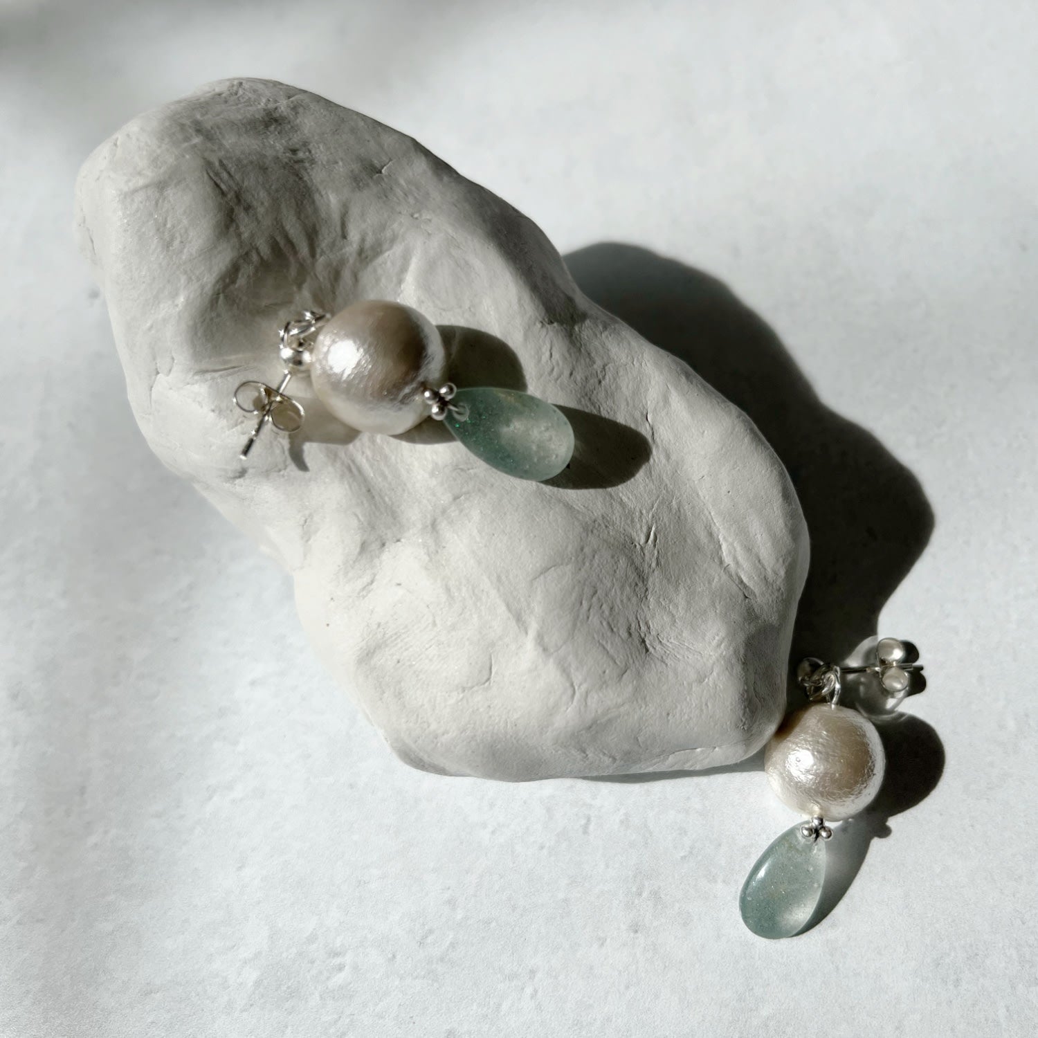 These dangle earrings are handcrafted in London from recycled sterling silver, Miyuki pearls (made from 100% pressed cotton), and Bio-Gems (handcrafted from plant fibers). They are vegan-friendly.