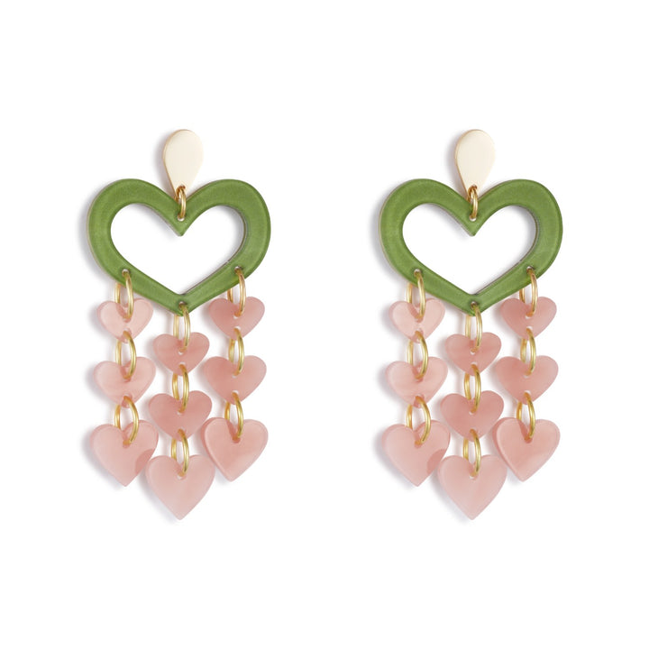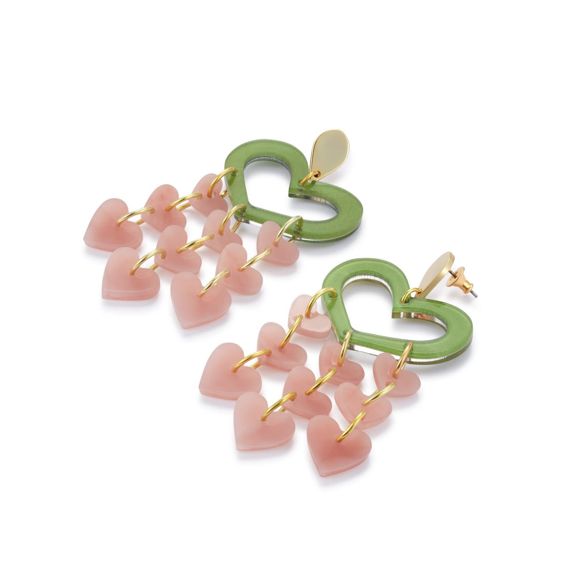 These chandelier earrings have a heart design and are made with pink and green materials. They are a statement piece but are lightweight.