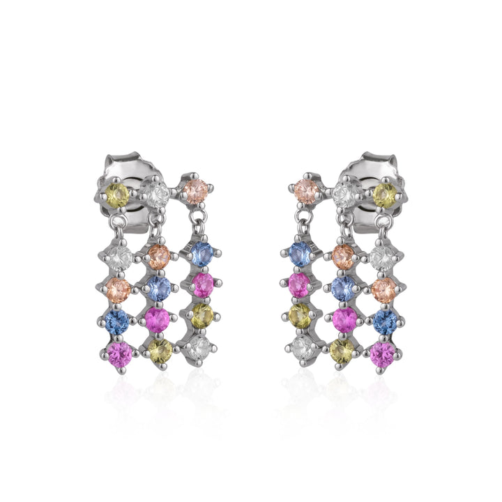 These cluster stud drop earrings are crafted from sterling silver and are set with a variety of colorful jewels.
