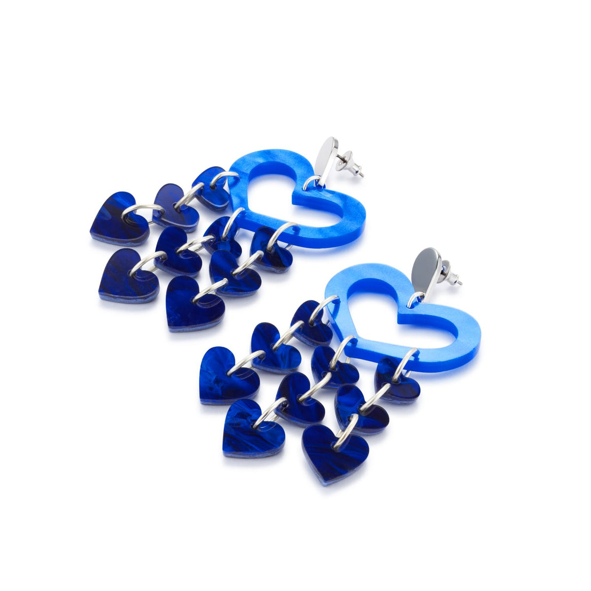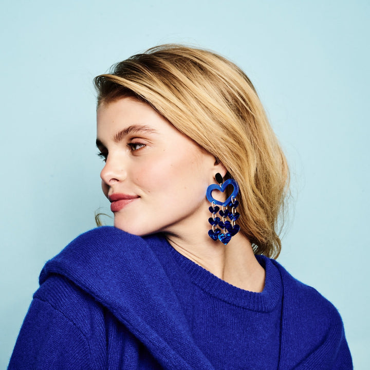 Our Heart Chandeliers - Blue by Toolally are a bold and dramatic statement piece. These hearts, big on impact yet lightweight, are a celebration of love and self-expression. They effortlessly bring a playful charm to daytime looks and turn up the glamour for big nights out. These earrings symbolize a fearless heart, perfect for those who want to make a confident and stylish impression with a touch of fun.
