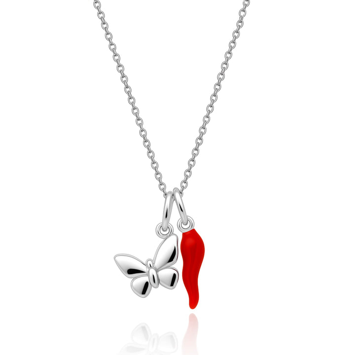 This Butterfly & Lucky Charm Necklace by Unaloe blends symbolism and Italian tradition in a graceful design. Featuring a butterfly for freedom and transformation alongside a red coral Cornicello amulet for protection, it becomes both a personal talisman and a stylish everyday accessory.
